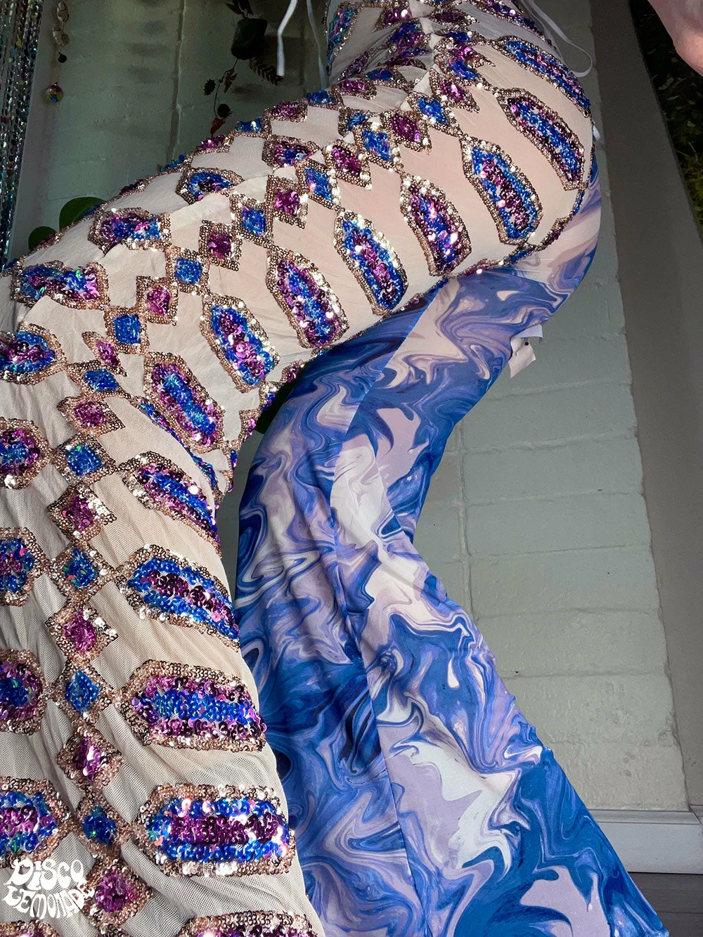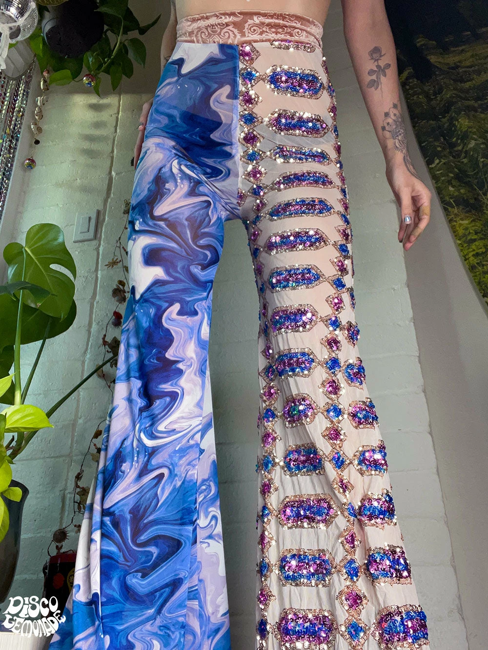 Half trippy mesh and half sequin bell bottoms with velvet waist band.