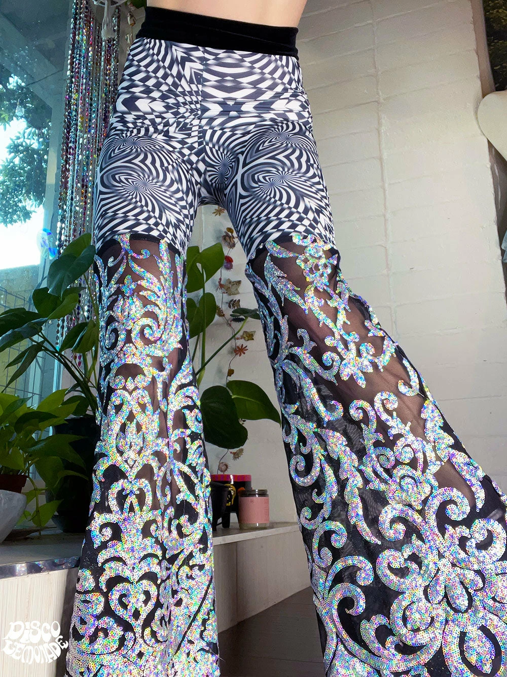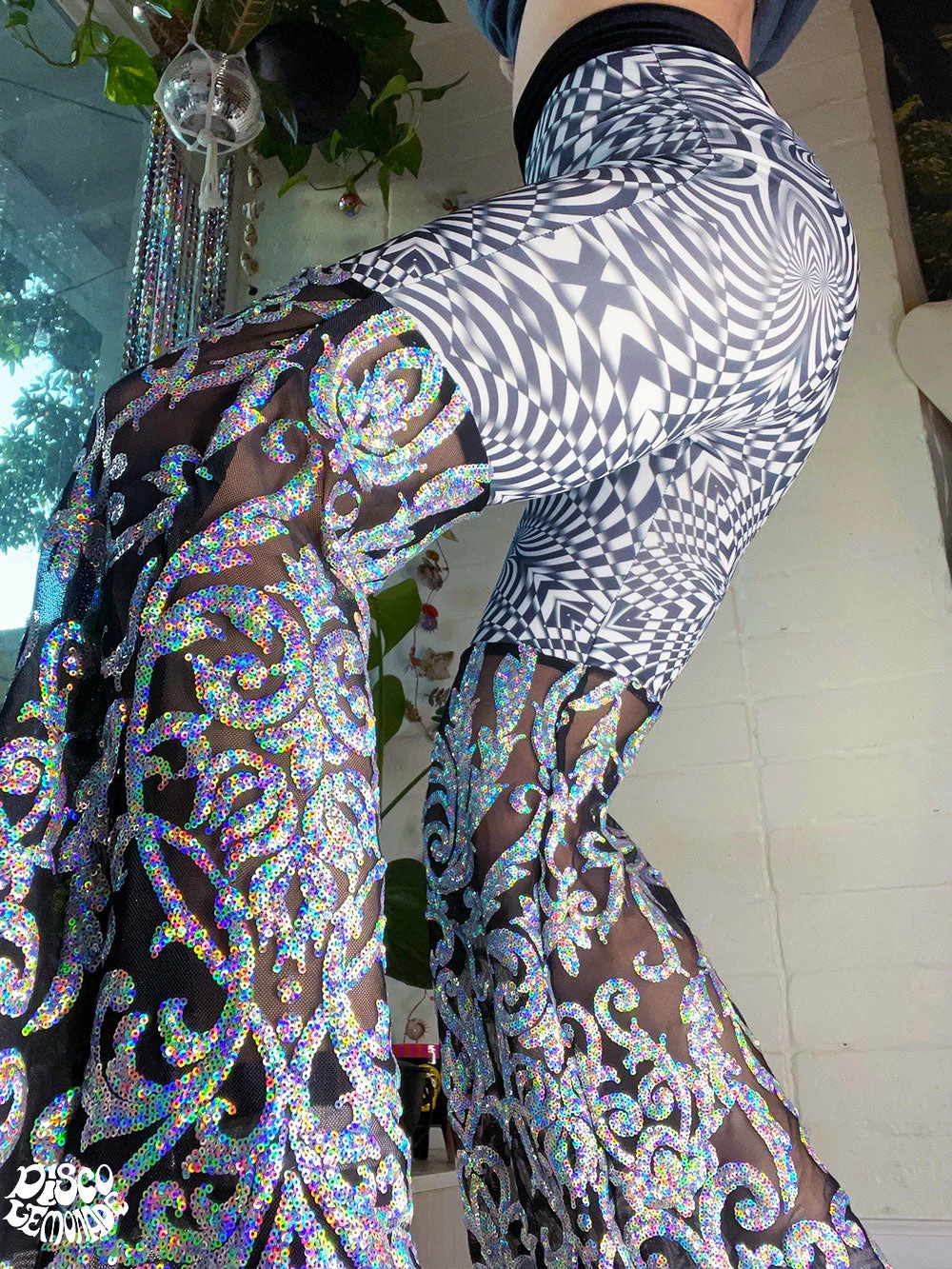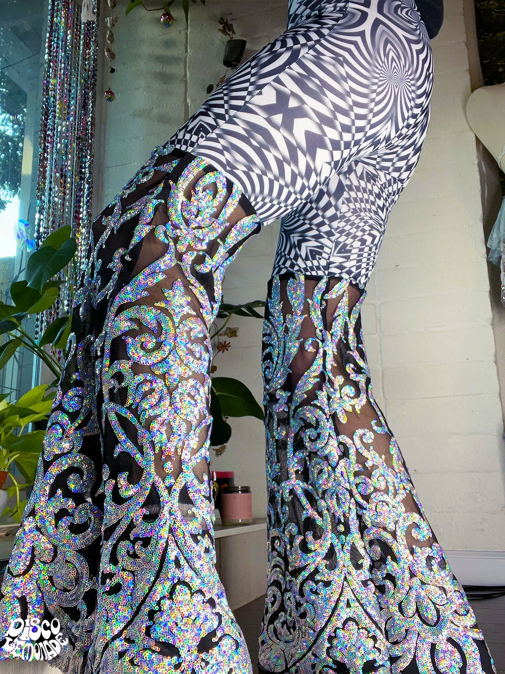 Stretchy velvet with silver rainbow sequin bell bottoms.