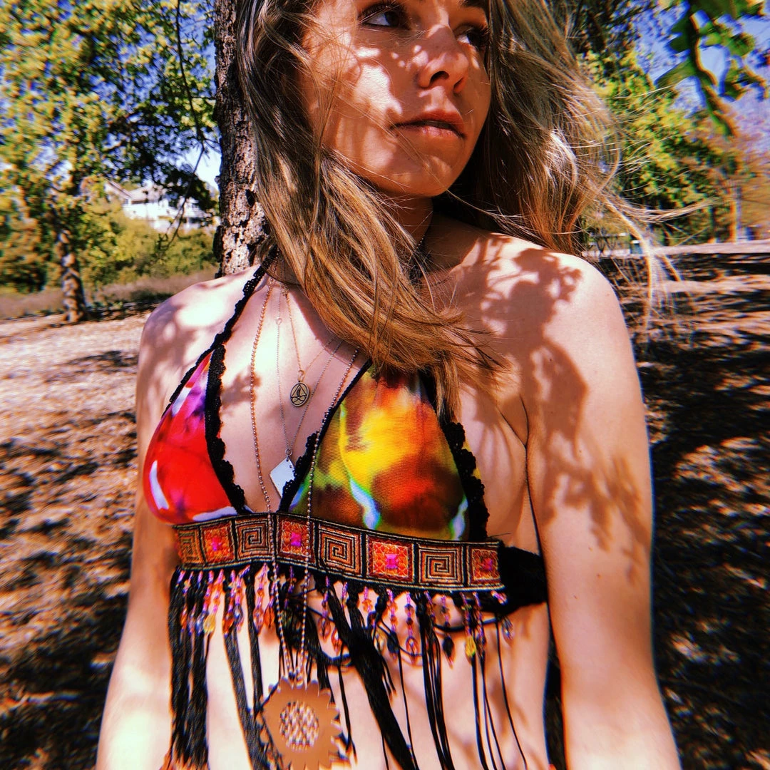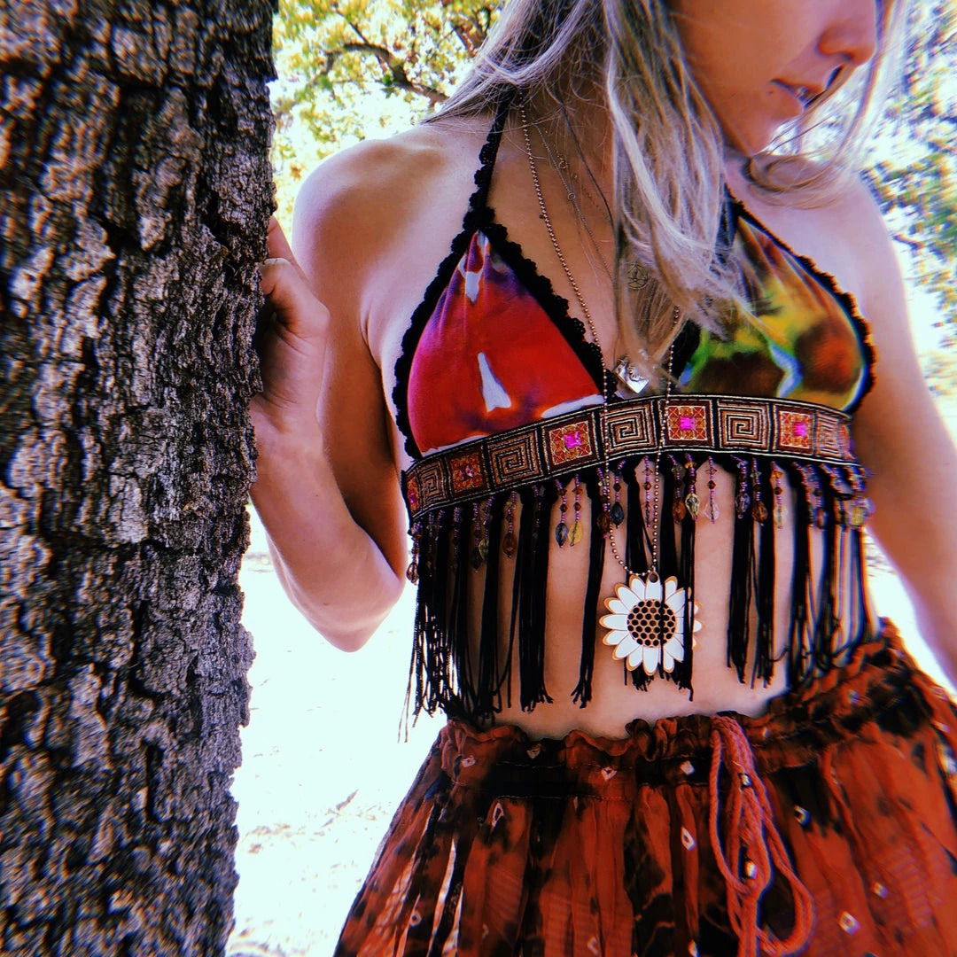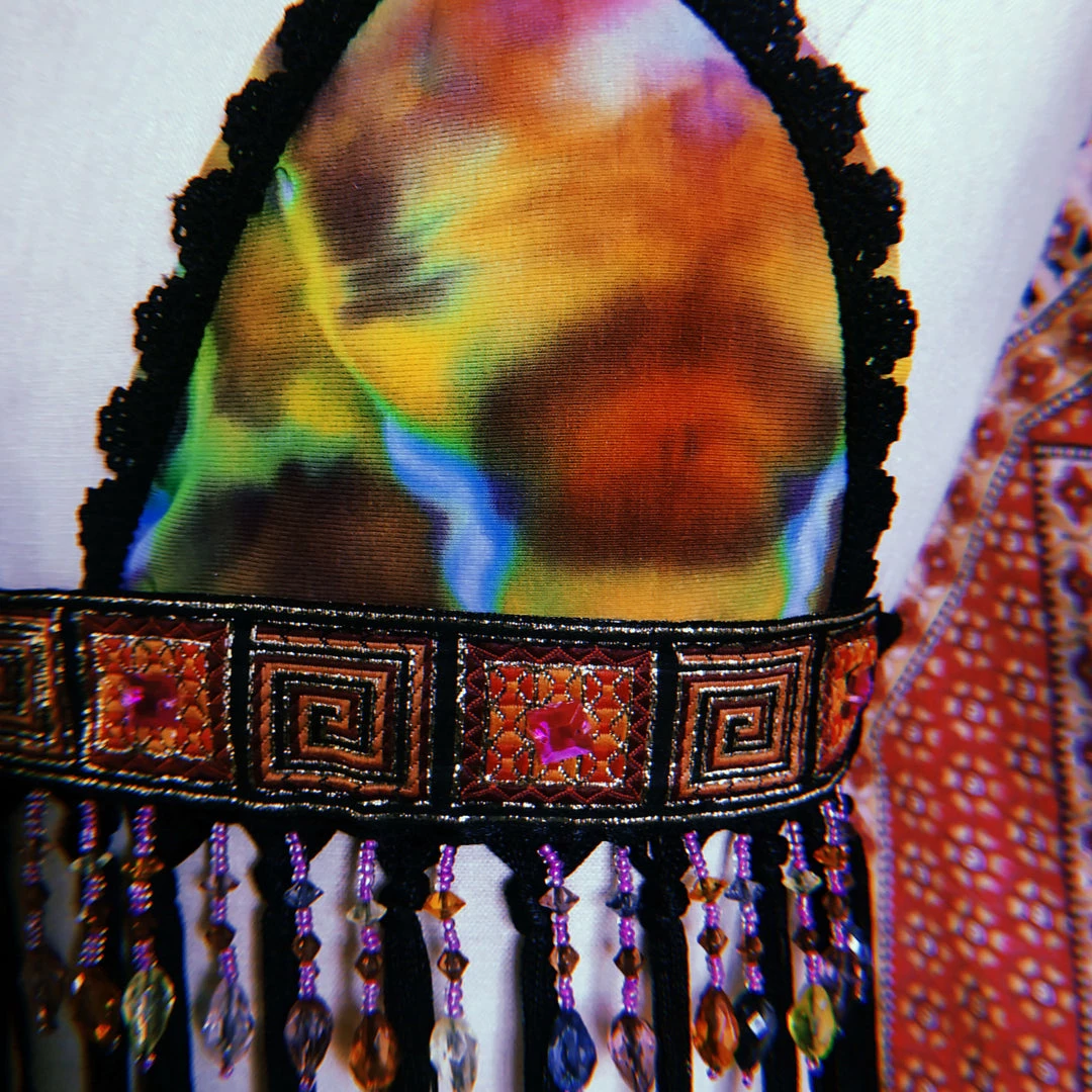 Recycled fabric from angel PSYdye {IG}~ the Calypso Disco Top is perfect for your next T R I P to another level of consciousness ~ Funky sparkly trim with orange, green, purple & blue beading ~ you will be G L O W I N G anywhere & everywhere you go in this colorful piece ~