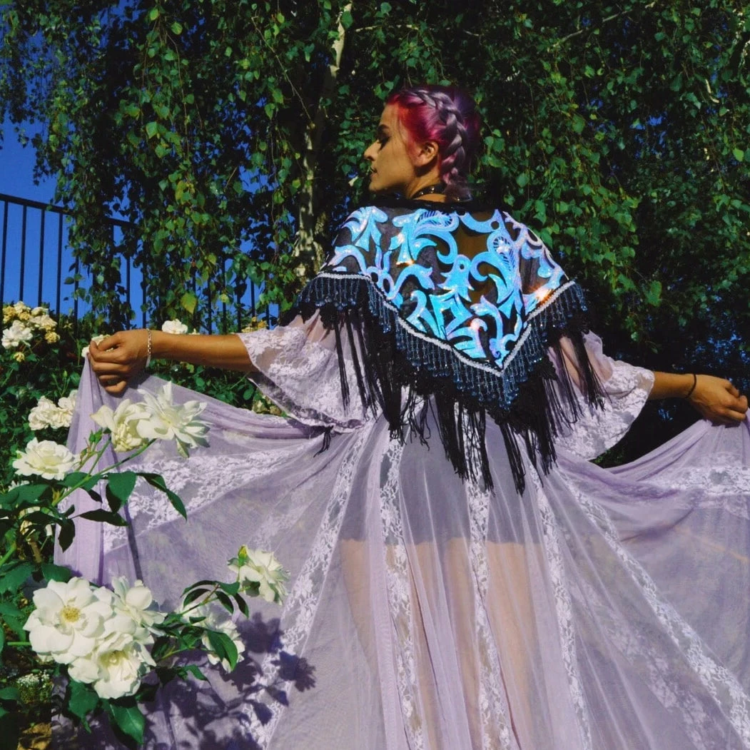 A mystical water creature flowing with the waveZz of the ocean ~ all my Cancer babieZZ wherever the sign may lie in your chart ~ this shawl was inspired by you & the sea ~ Alluring to say the least, this whimsical piece will make you feel like a dancing fairy floating across the open sea