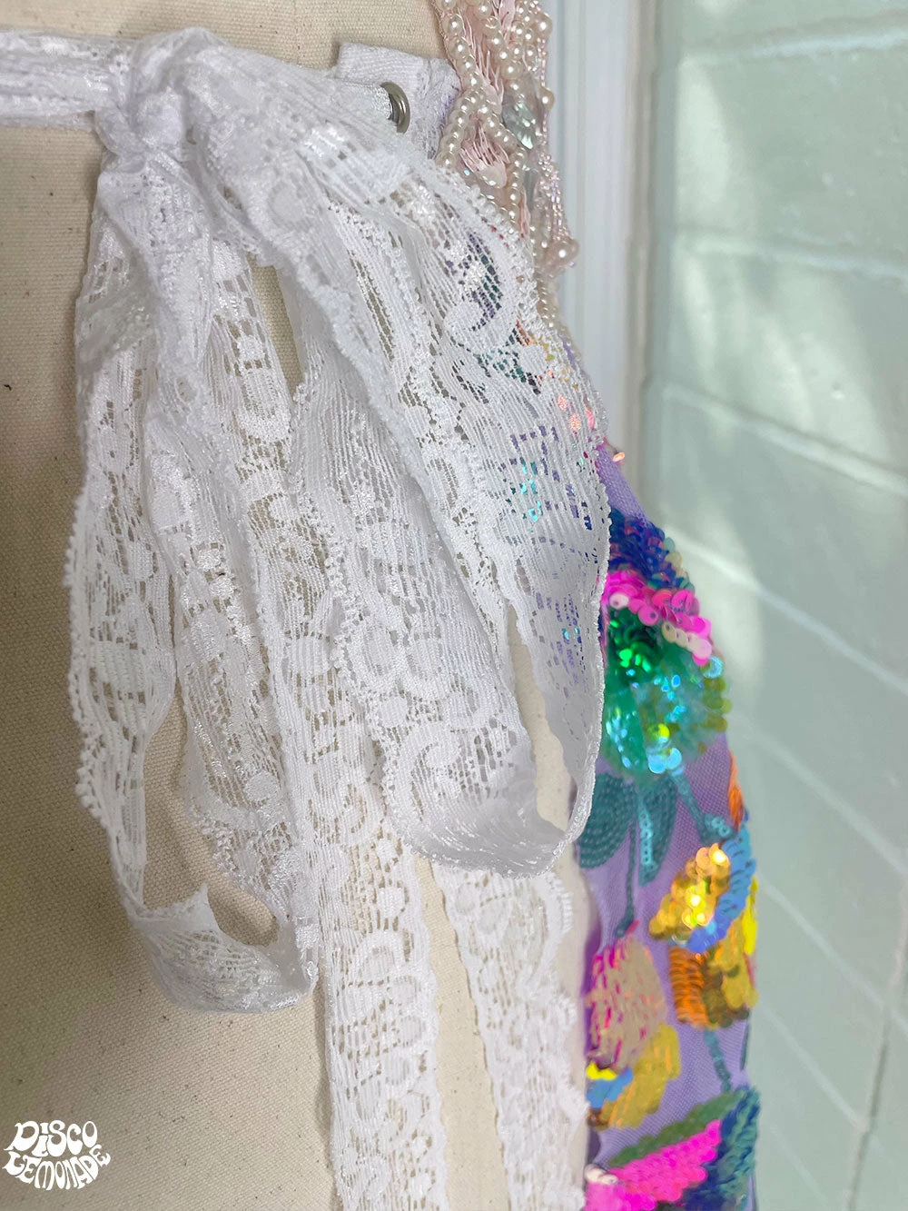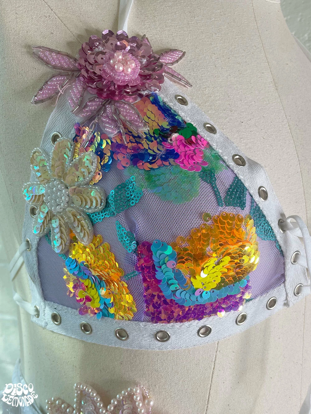Iridescent sequin flowers on lavender mesh set with white detailing & hand beaded sequin embellishments.