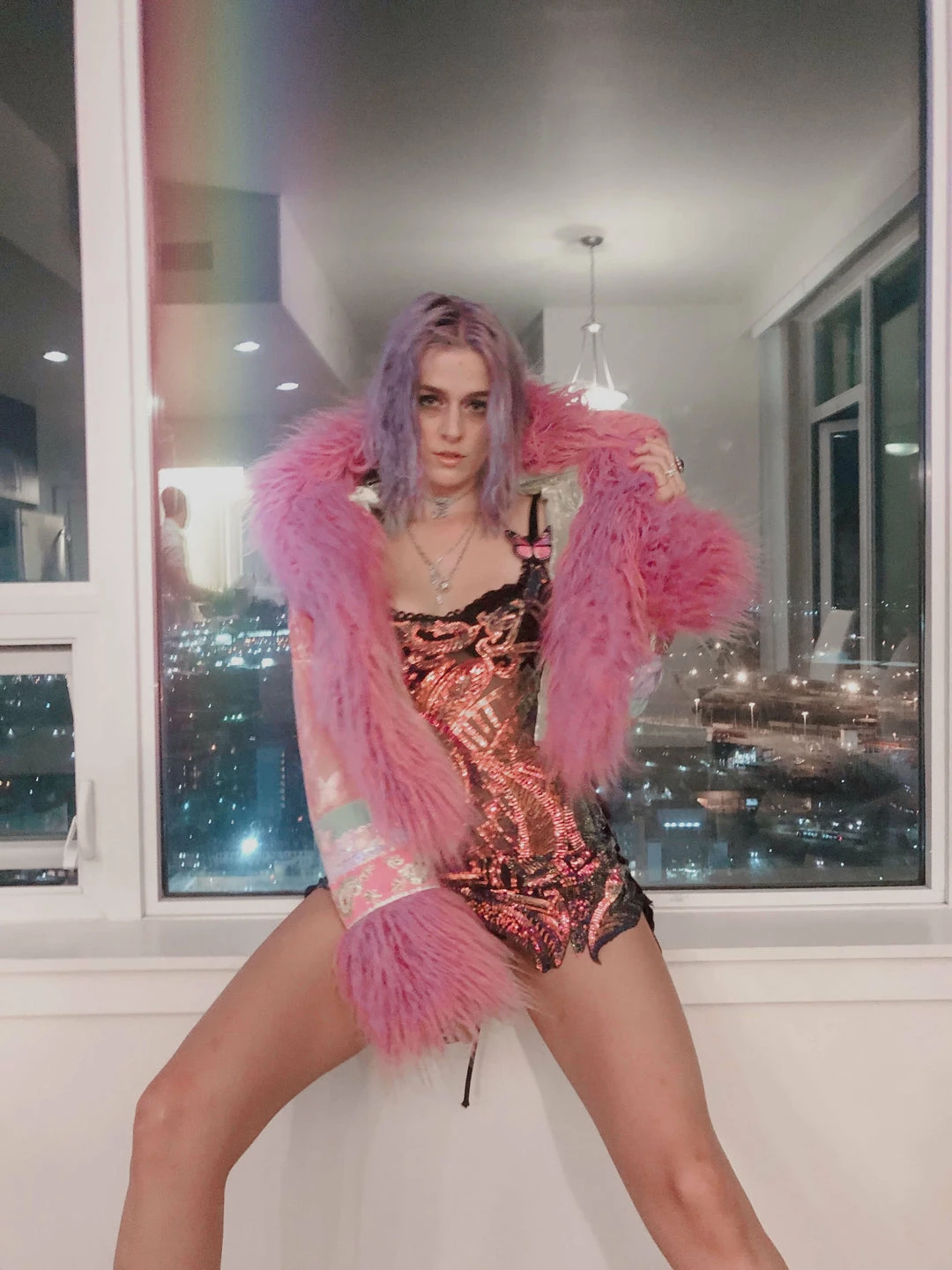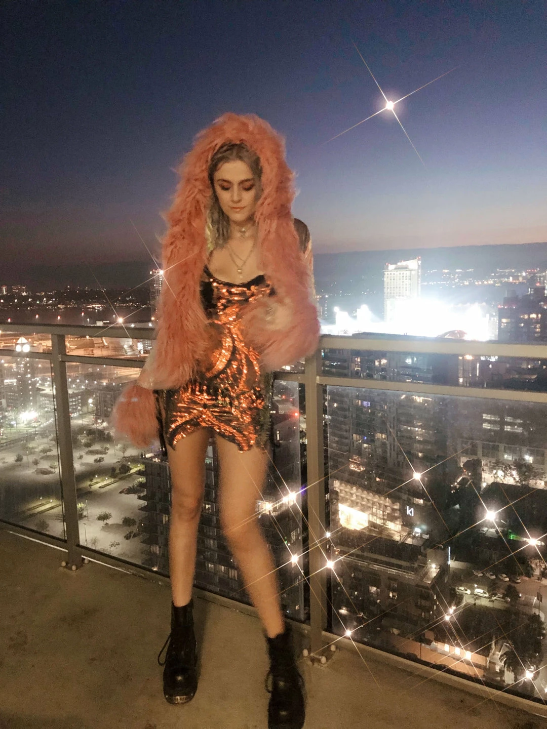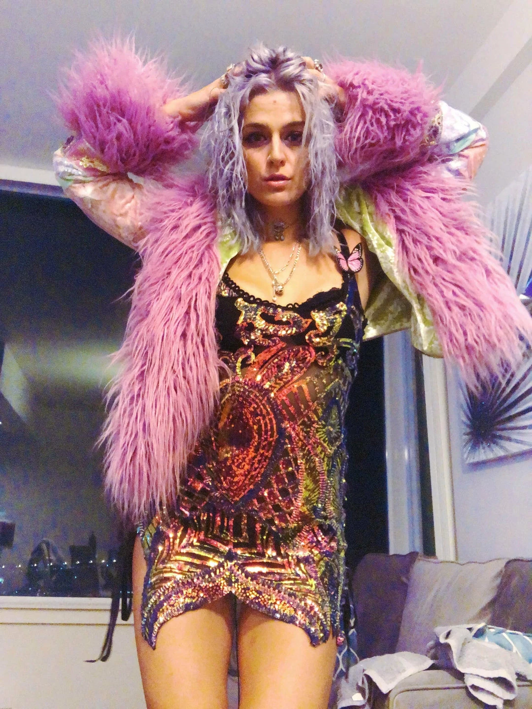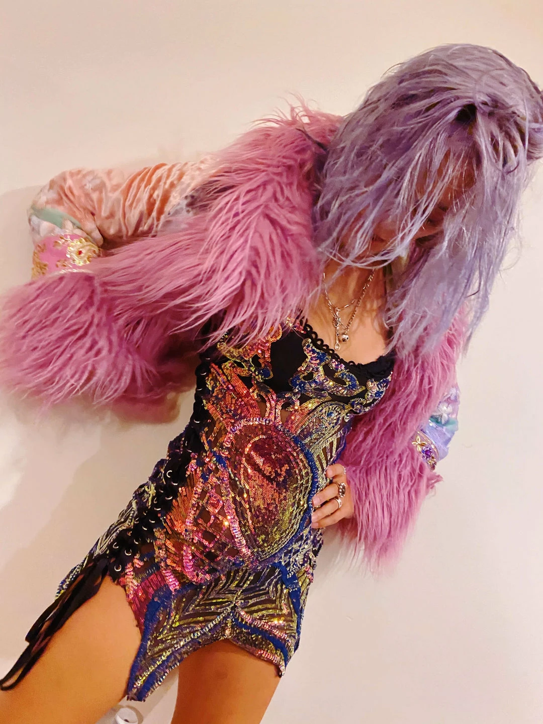 The Radiance Disco Dress is truly 10x more mesmerizing in real life. The sequin fabric shines purples & blues in certain lighting and pinks, yellows & golds in the other lighting. She is a radiant thing. With lace up ties along both sides, this piece is incredibly adjustable and comfy. Adjustable straps along shoulder with butterfly accents. No lace up in back only on the sides 🙂