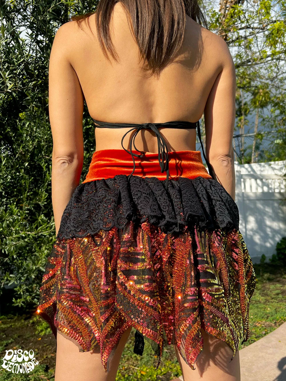 Velvet waist band with lace up ties with sequin & ruffle bustle.