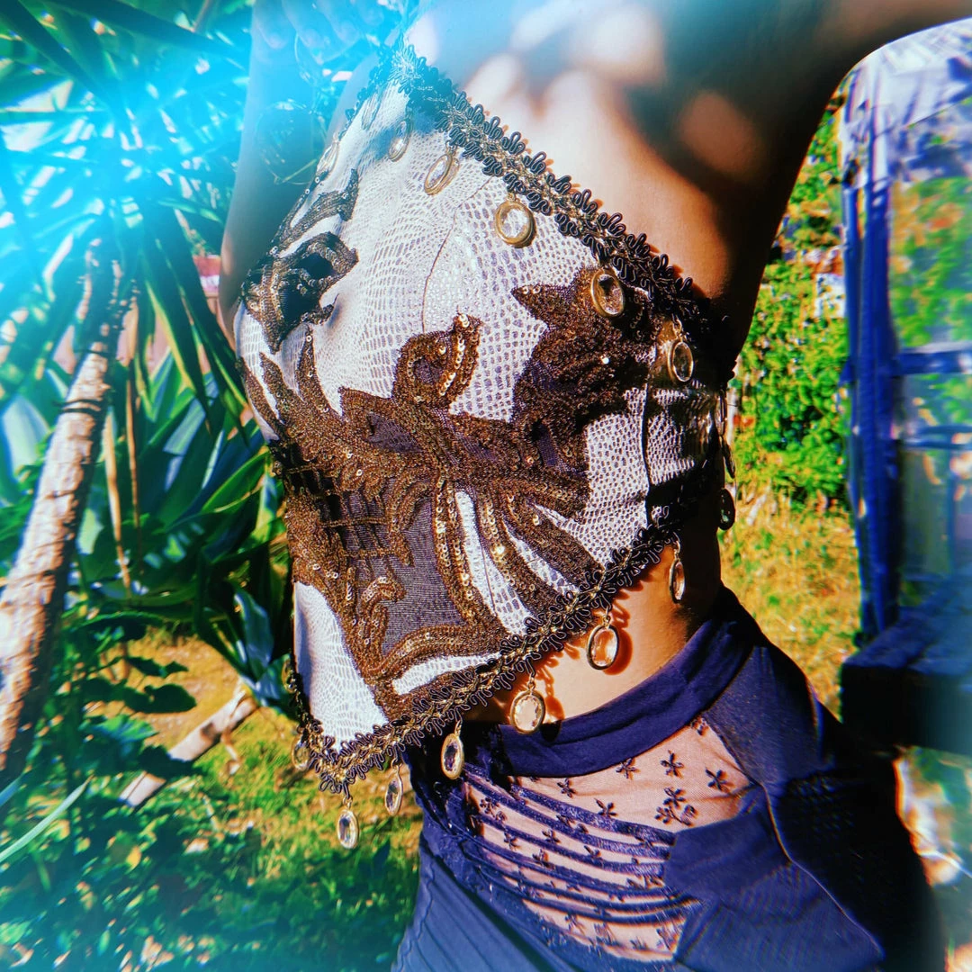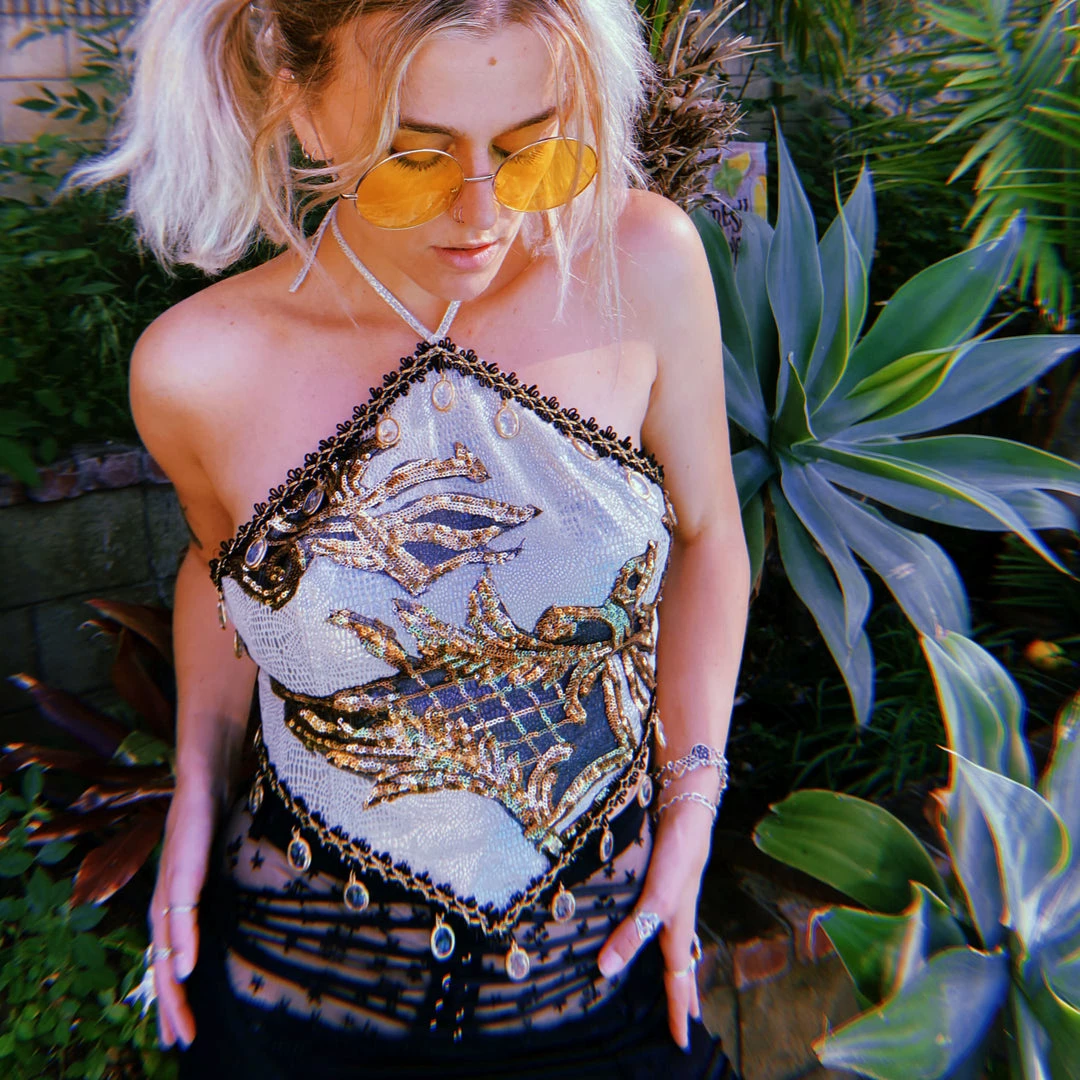 The Athena Tie Top ~ reworked vintage BEBE metallic snakeskin genuine leather tie top ~ with gold sequin accents & crystal beading along neckline and bottom