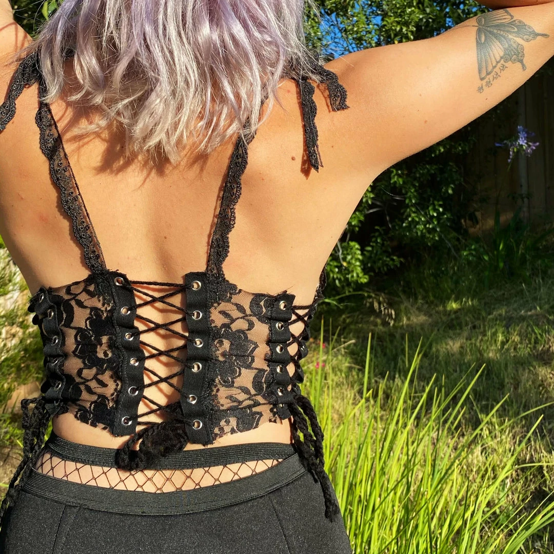 The Discozilla Disco Bra is a completely reconstructed vintage bra from Funky Fresh ~ this metallic rainbow oil slick inspired piece is one sexy thing! Made with laces, purple/gold & pink sequin ~ this piece glowZzz in the light ~ With corset ties along the sides and back ~ you can adjust the size to your waist & adjustable lace ties around the shoulders ~