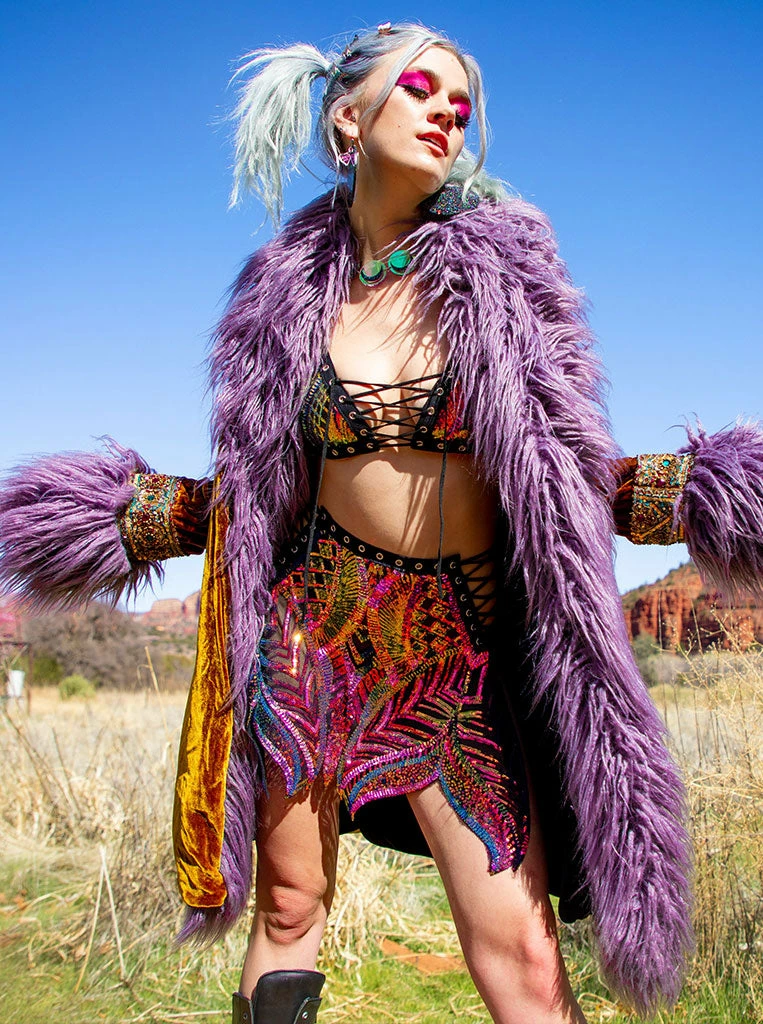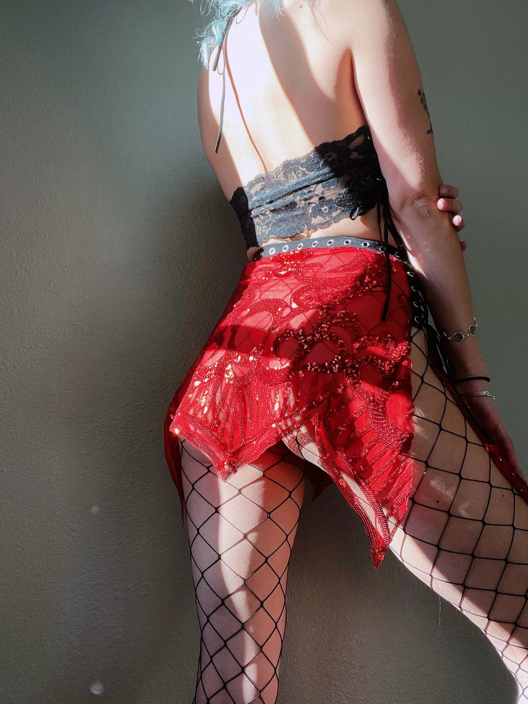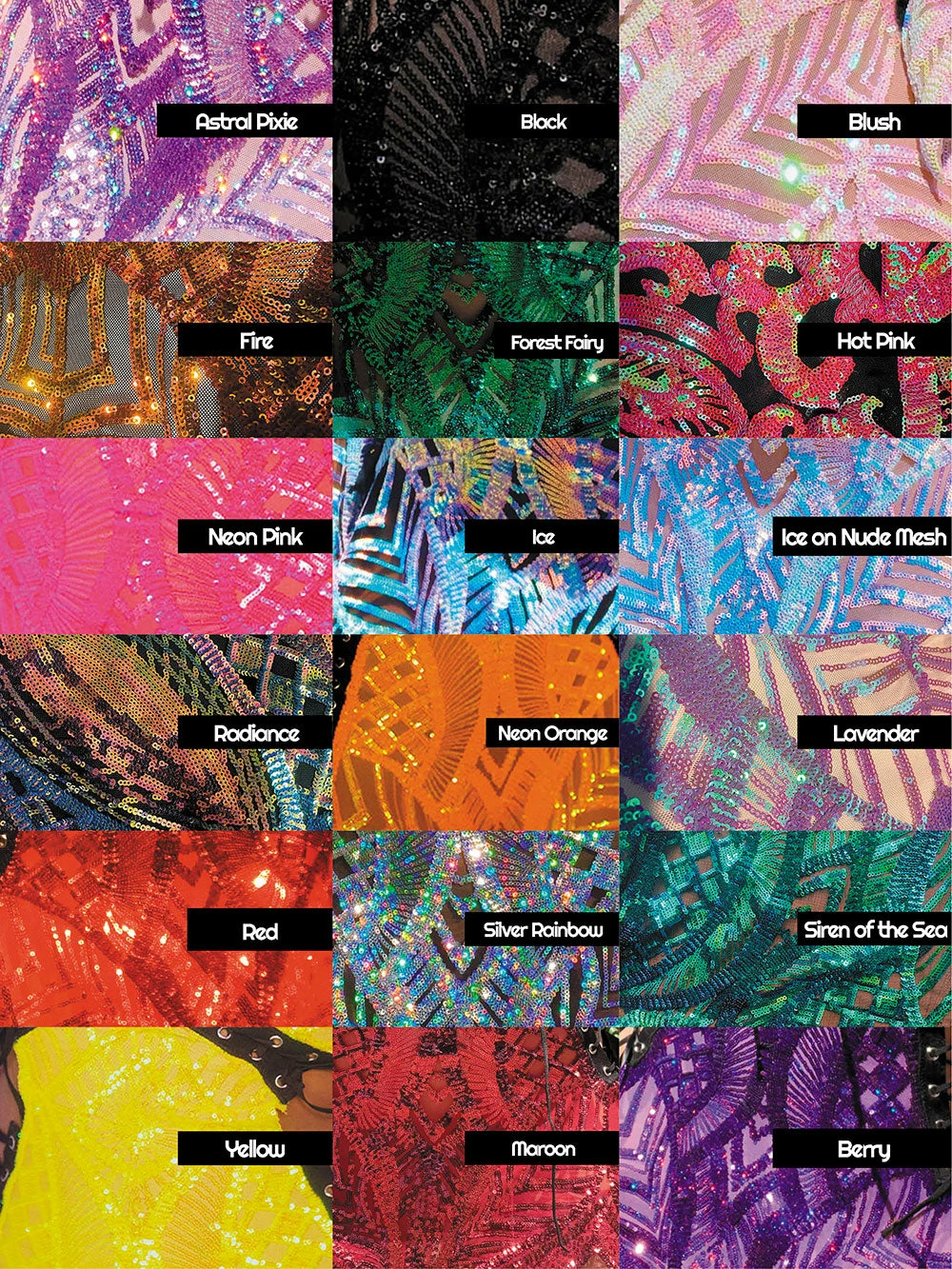 Sequin on four way stretch mesh Disco Skirt with black lace up grommets for a comfortable, adjustable fit. More colors available.