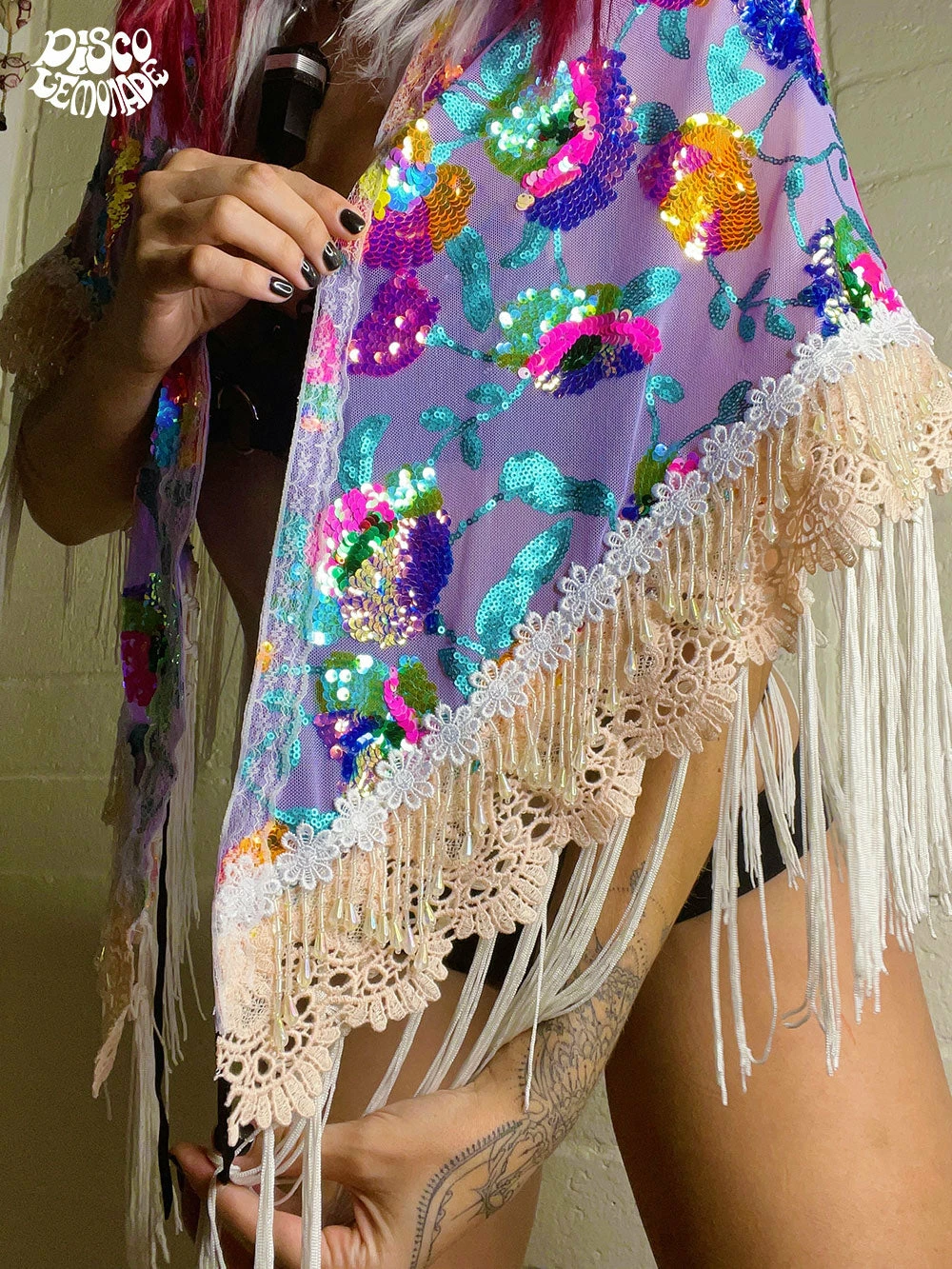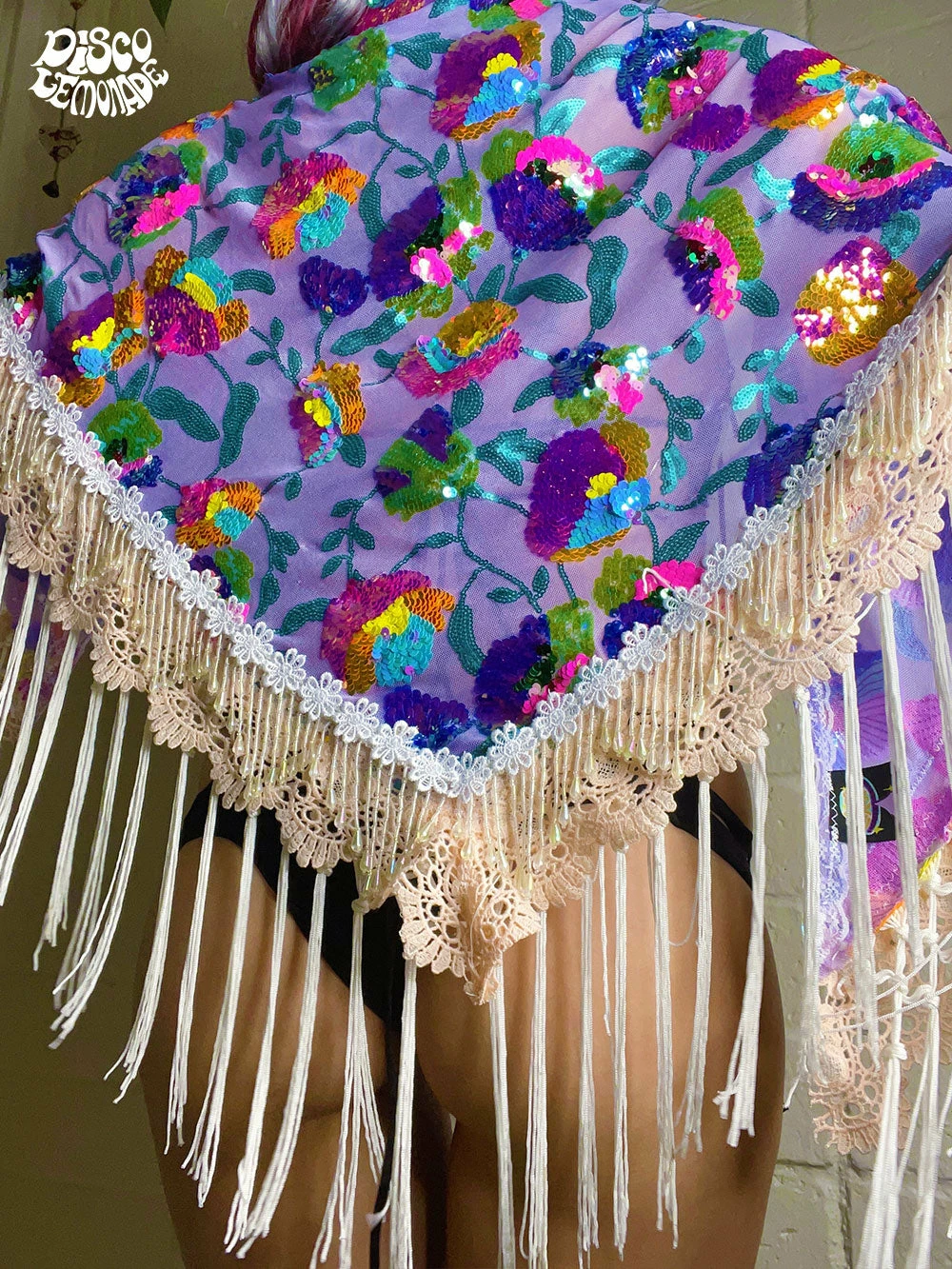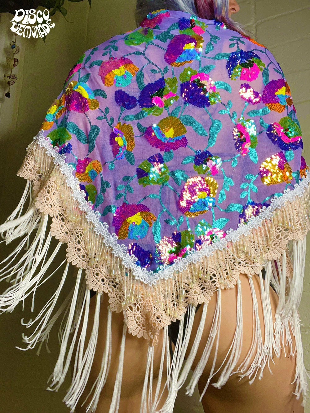 Purple floral sequin Goddess Shawl ~ with ivory fringe, blush lace trimming & deardrop beading.
