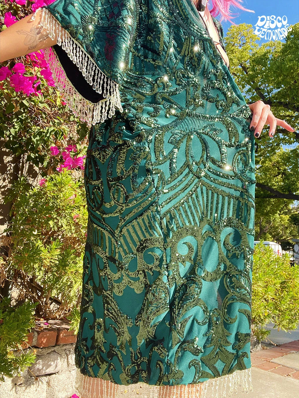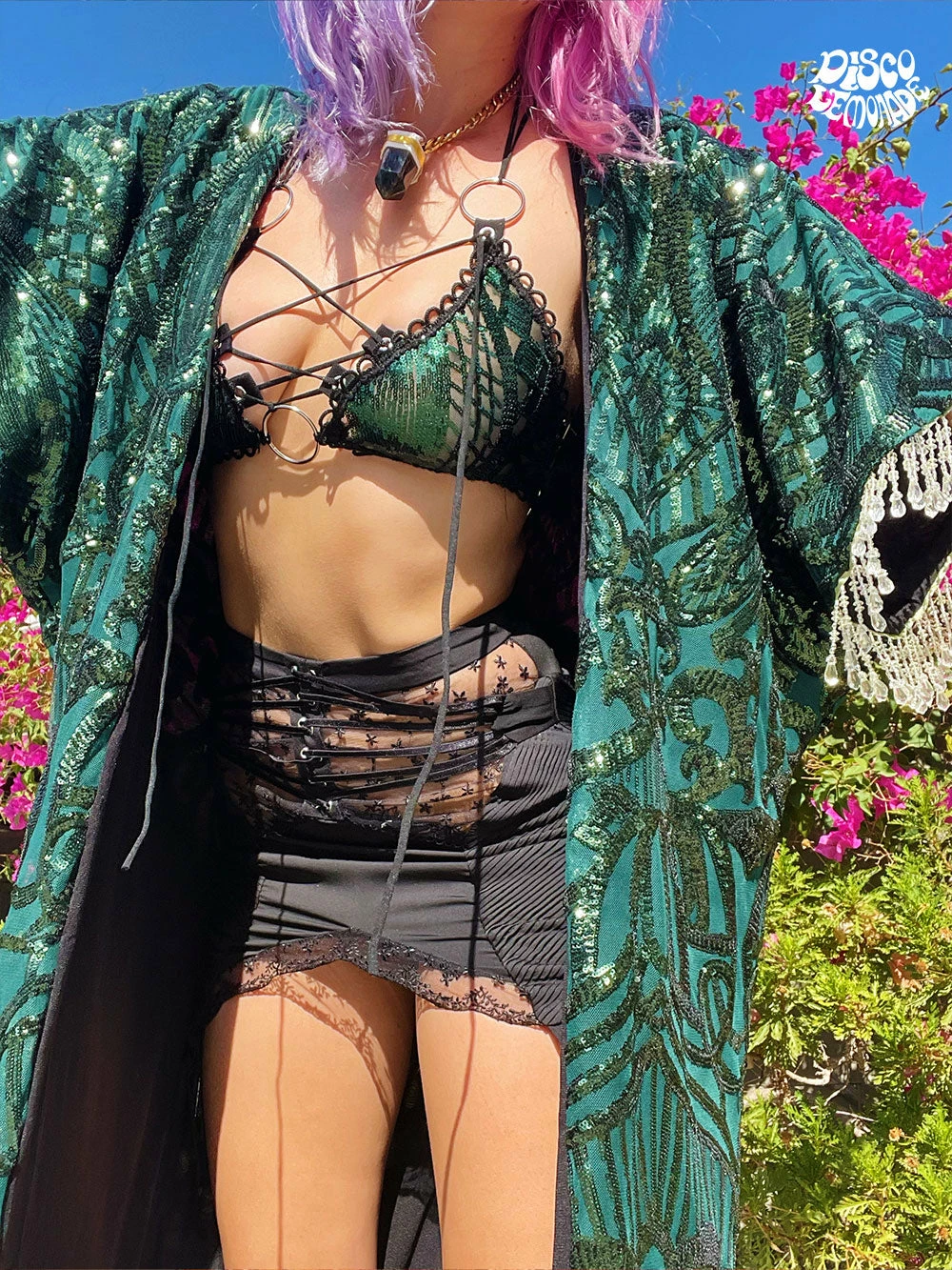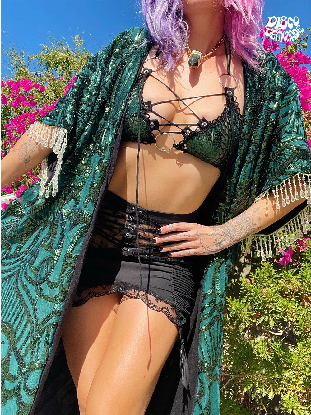 The ultimate layering piece that is as effortless as it is extra. This robe is trimmed with sturdy, high-quality beading for an extra layer of sparkle. It is also completely lined with high quality helenca fabric so there are absolutely no sequin scratchies!