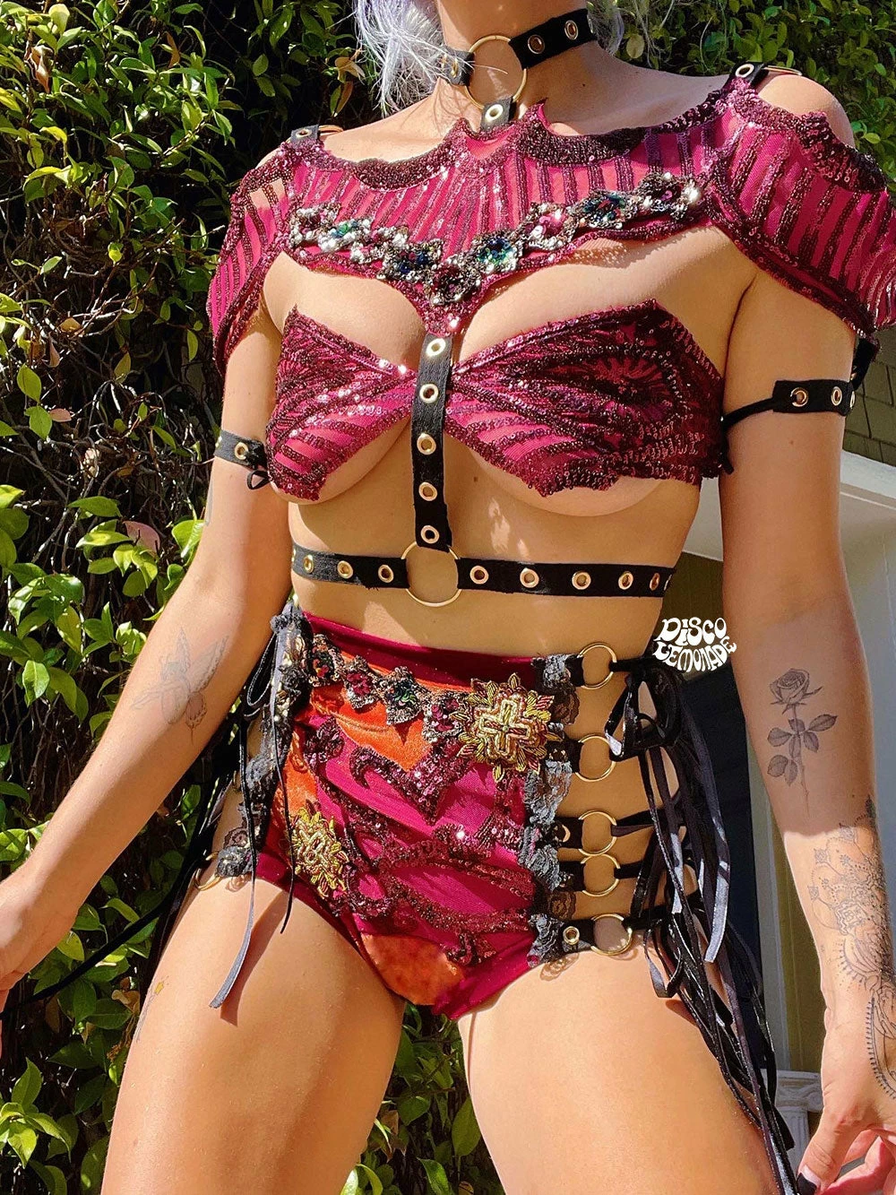This one of a kind Disco Set is made for the fairy warrior goddess.with a maroon sequin shoulder piece, strapless top