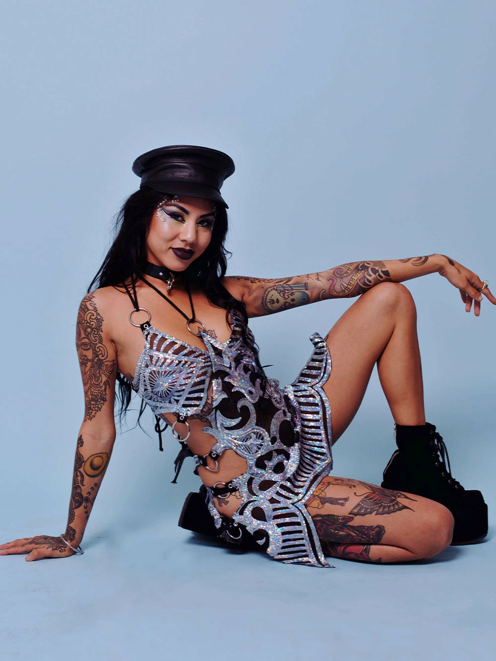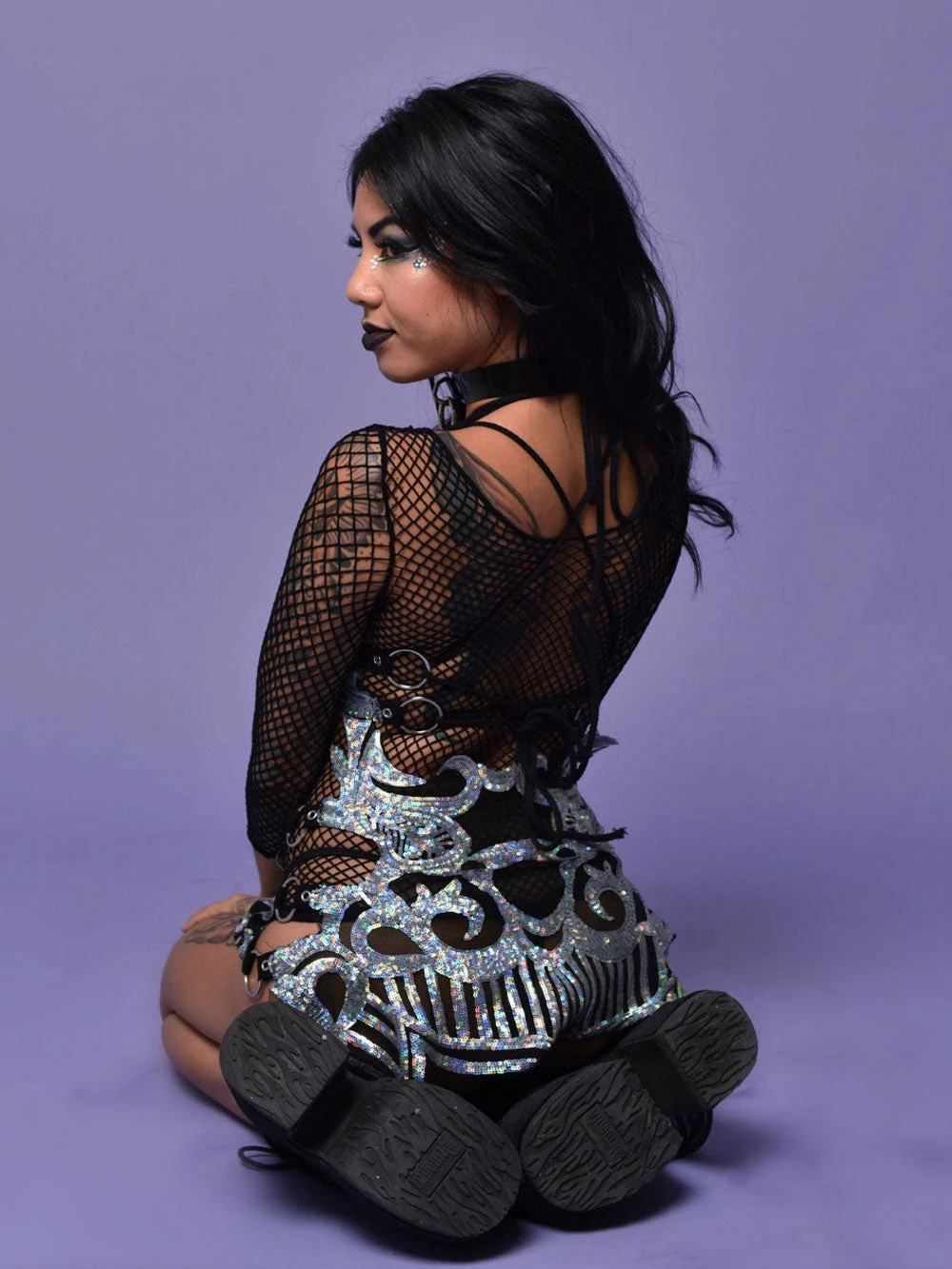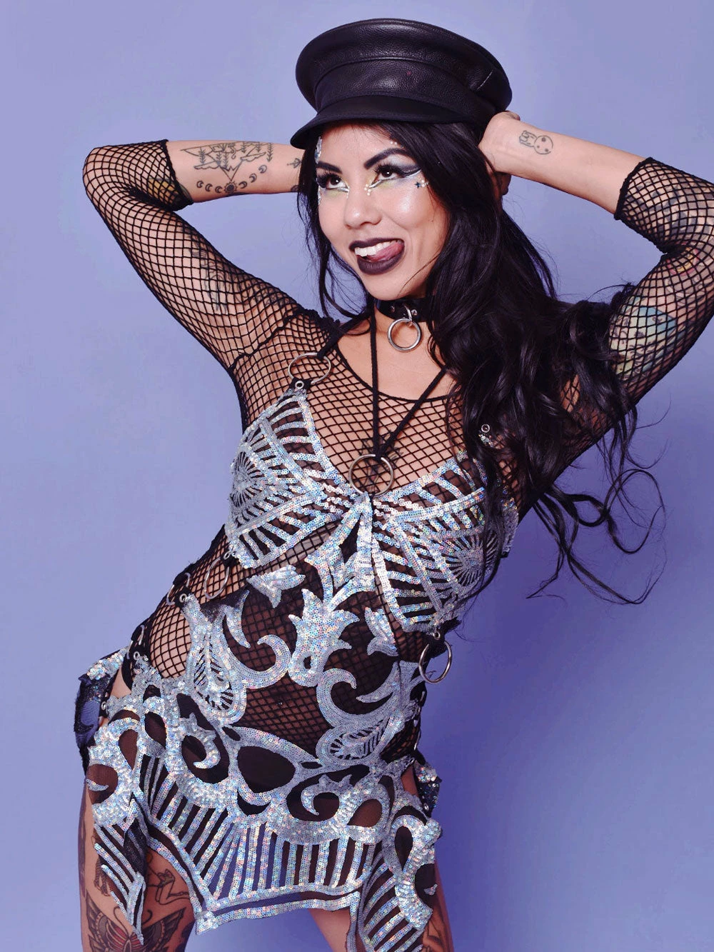 Silver sequin rainbow iridescent Fairy But Make it Ho Disco Dress with o ring detailing.