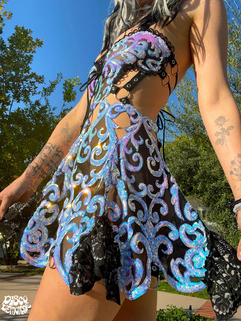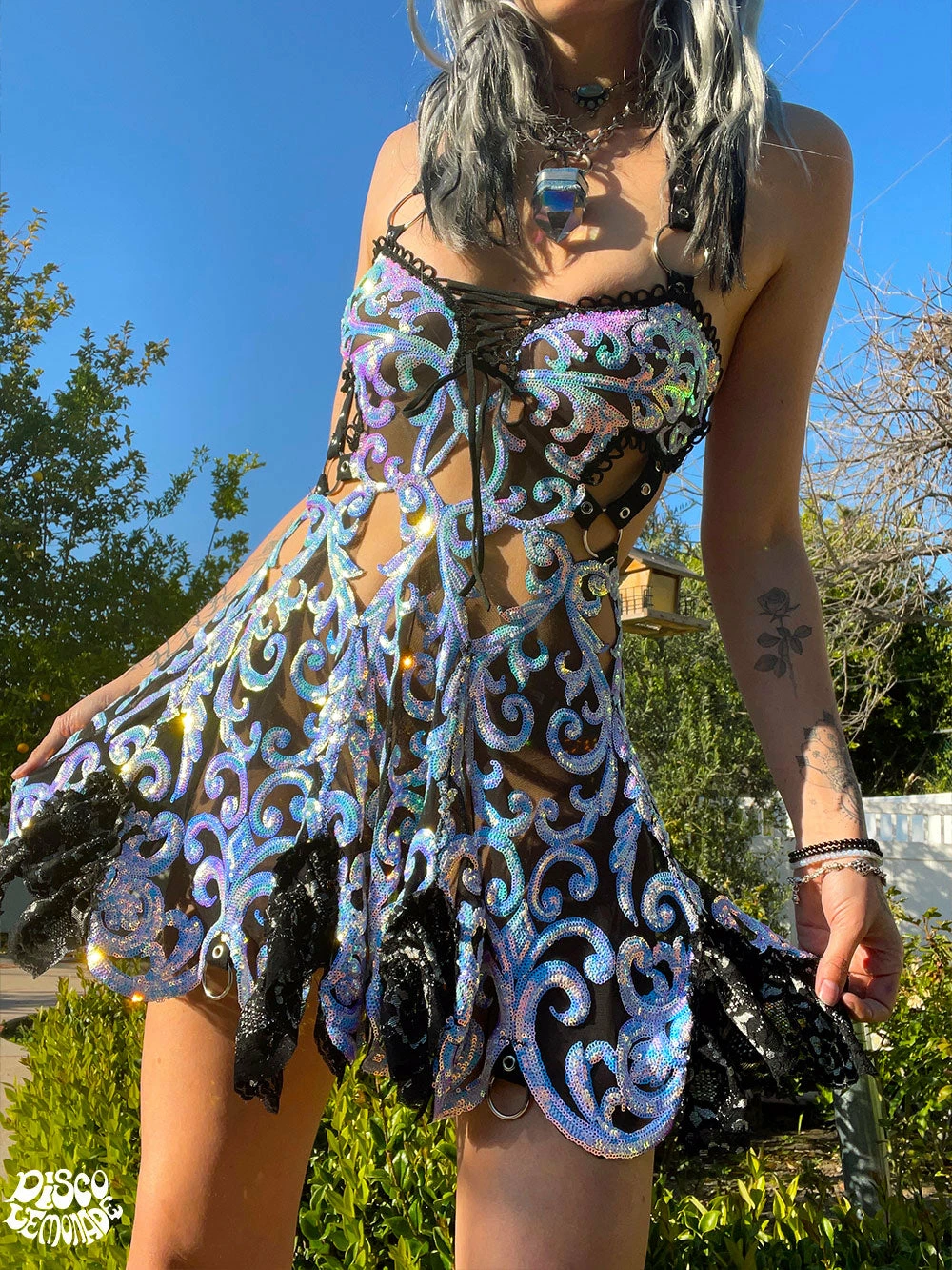 Iridescent icy blue on black 4 way stretch mesh cut out flowy dress with black ruffle detailing & o rings. Butterfly shaped bust with lace up backing.Â