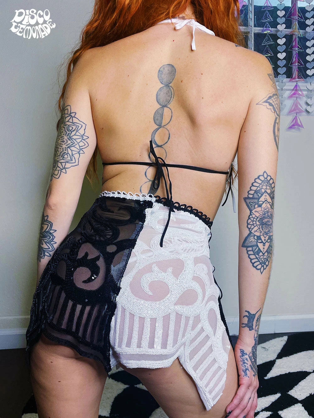Half black, half white sequin on 4 way stretch mesh Disco Skirt and Bad Bitch Disco Top, CRUELLA STYLE.