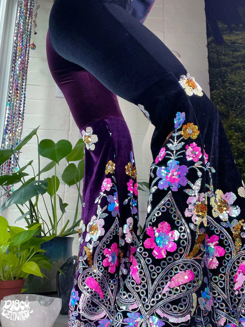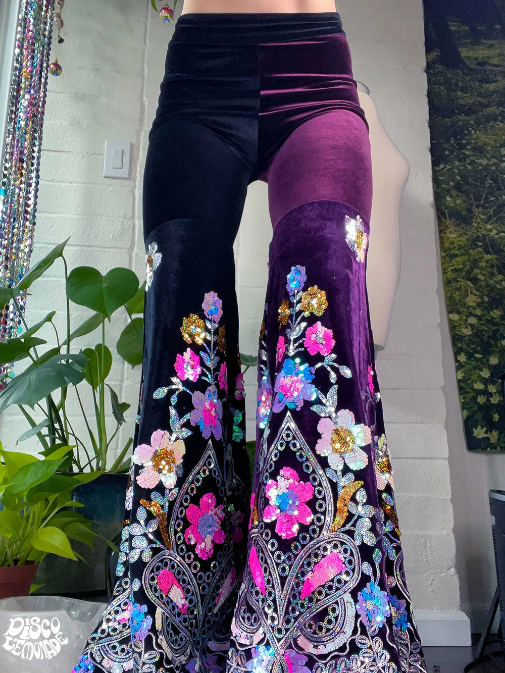 Half black and half deep purple stretchy bells with big beautiful sequin bell bottoms.