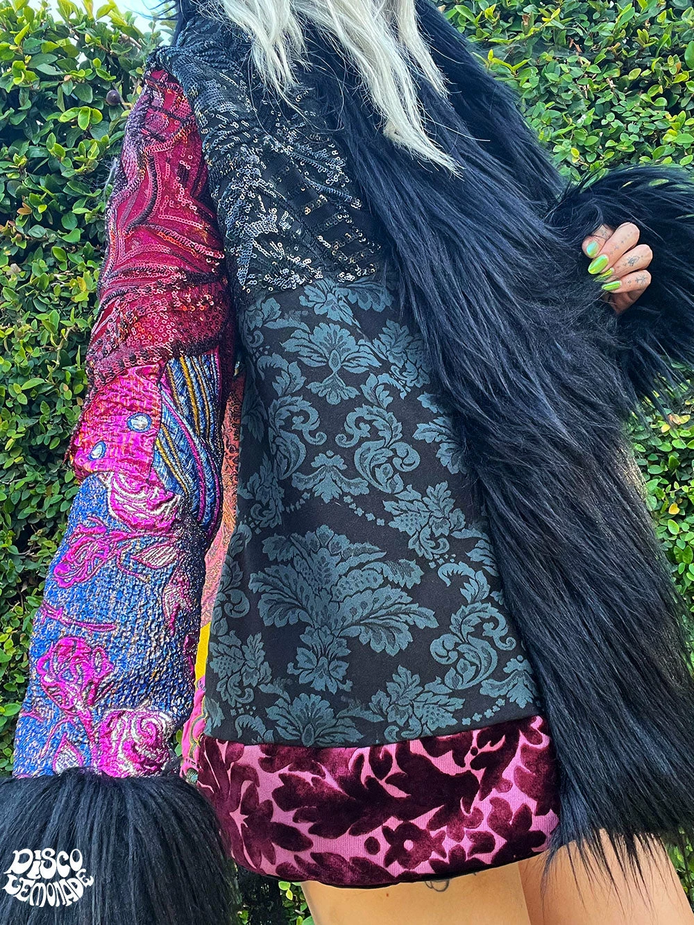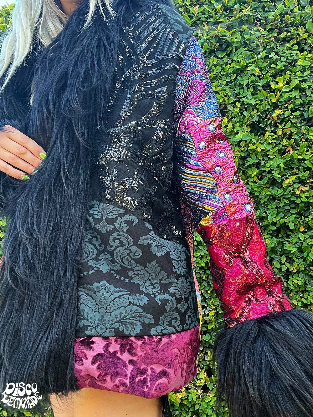 Sequin and brocade hip length coat.
