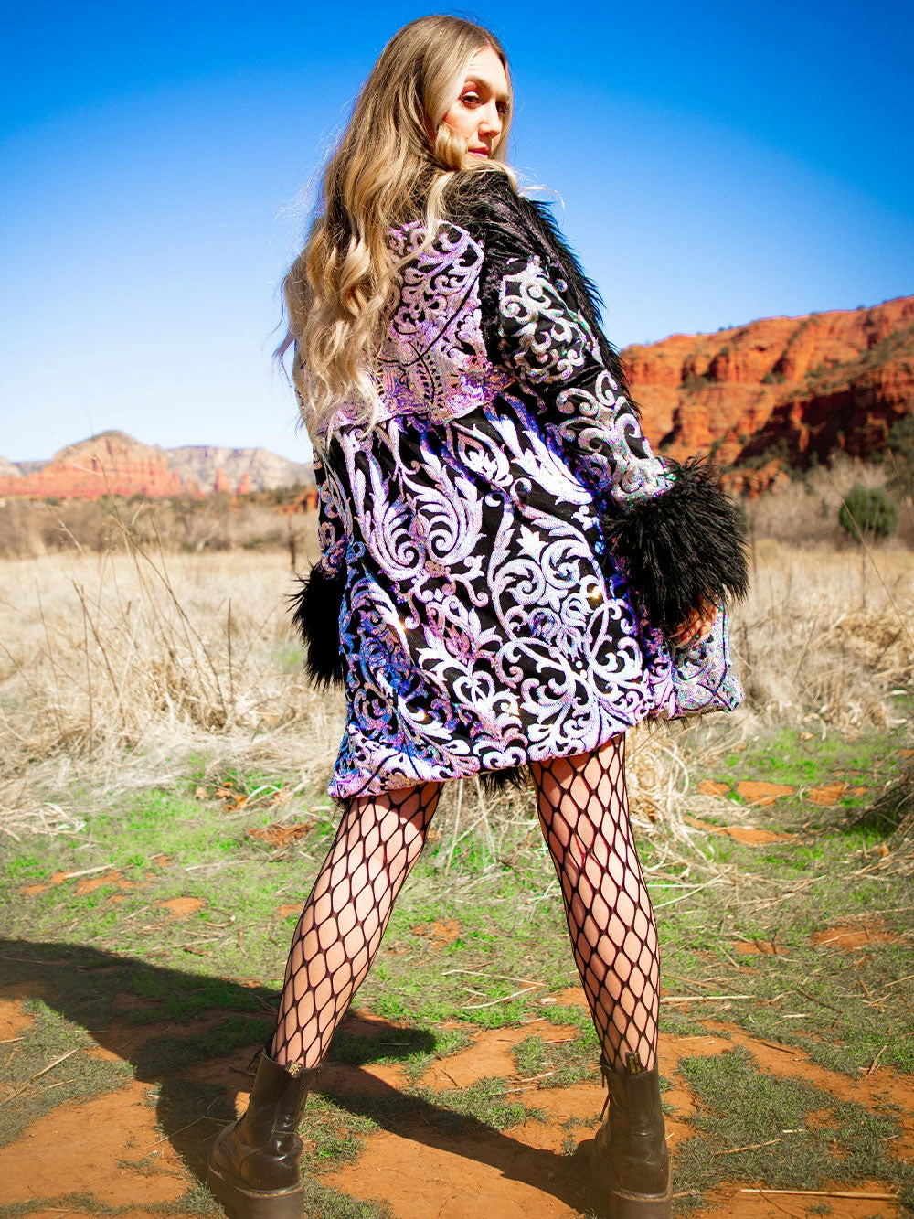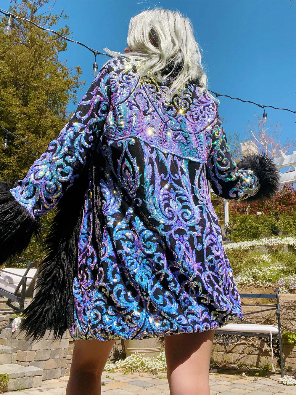 A coat of your disco daydreams ~ Shining silver rainbow iridescent sequin and icy blue iridescent sequin, these velvet lined coat is one sparkly sensation. With a faux fur collar and cuffs, she is the perfect coat for pretty much every day of your life.
