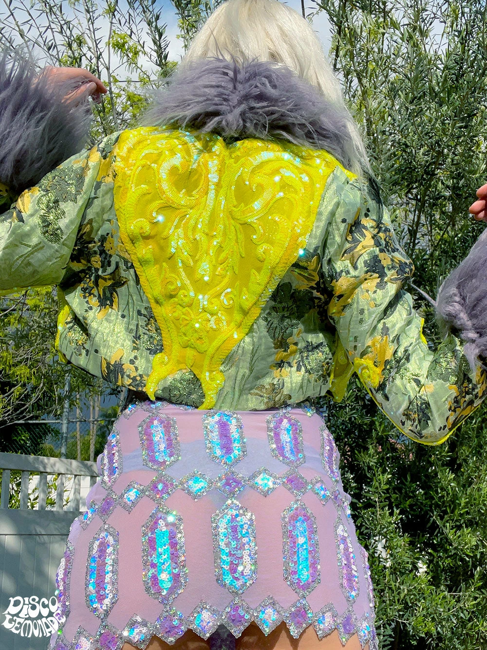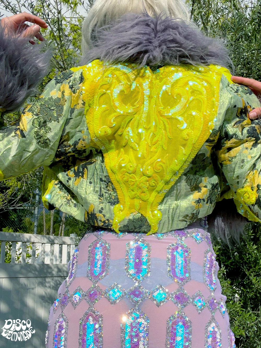 Sage green brocade with yellow damask sequin detail.