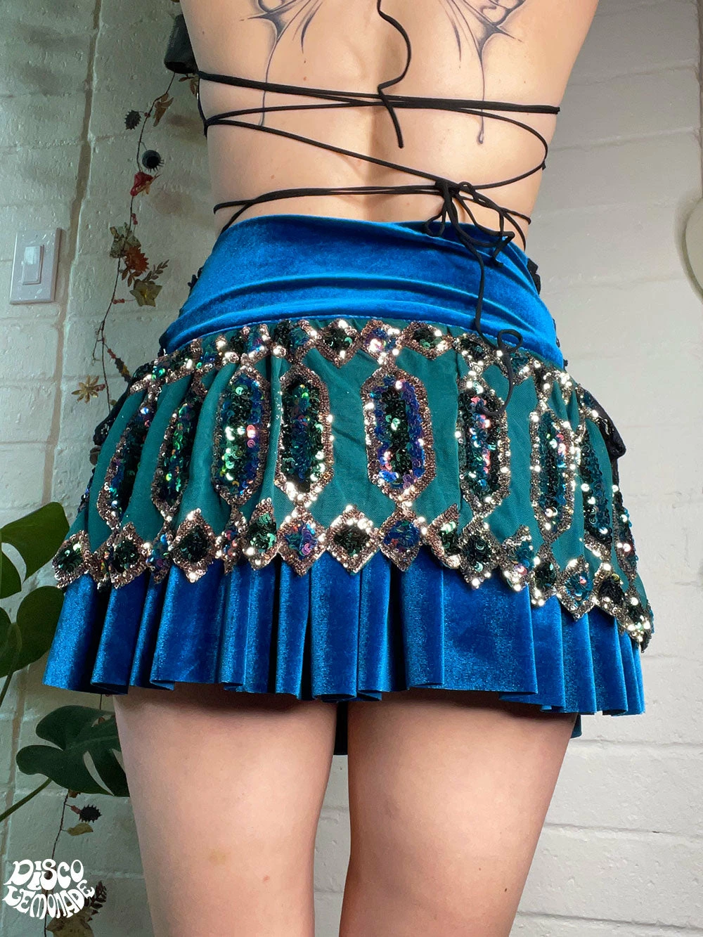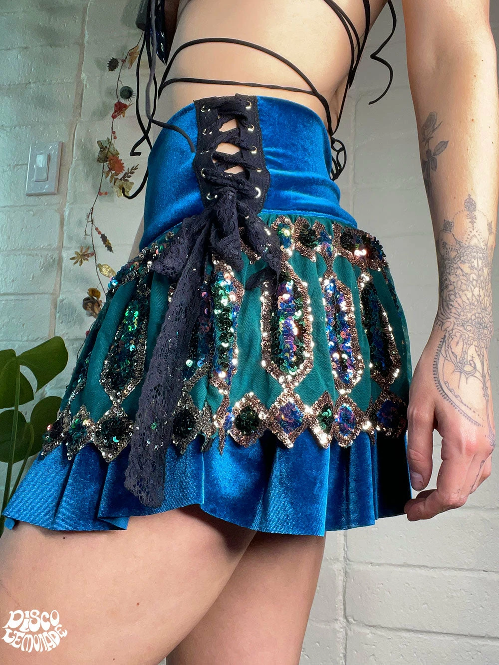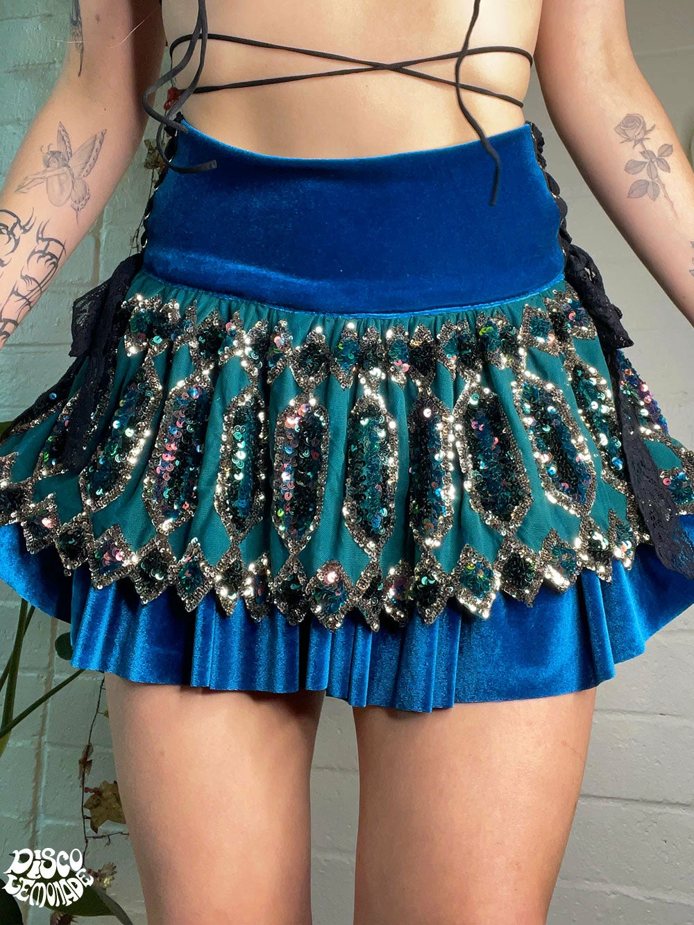 Velvet waist band with lace up ties with a sequin & velvet ruffle skirt.