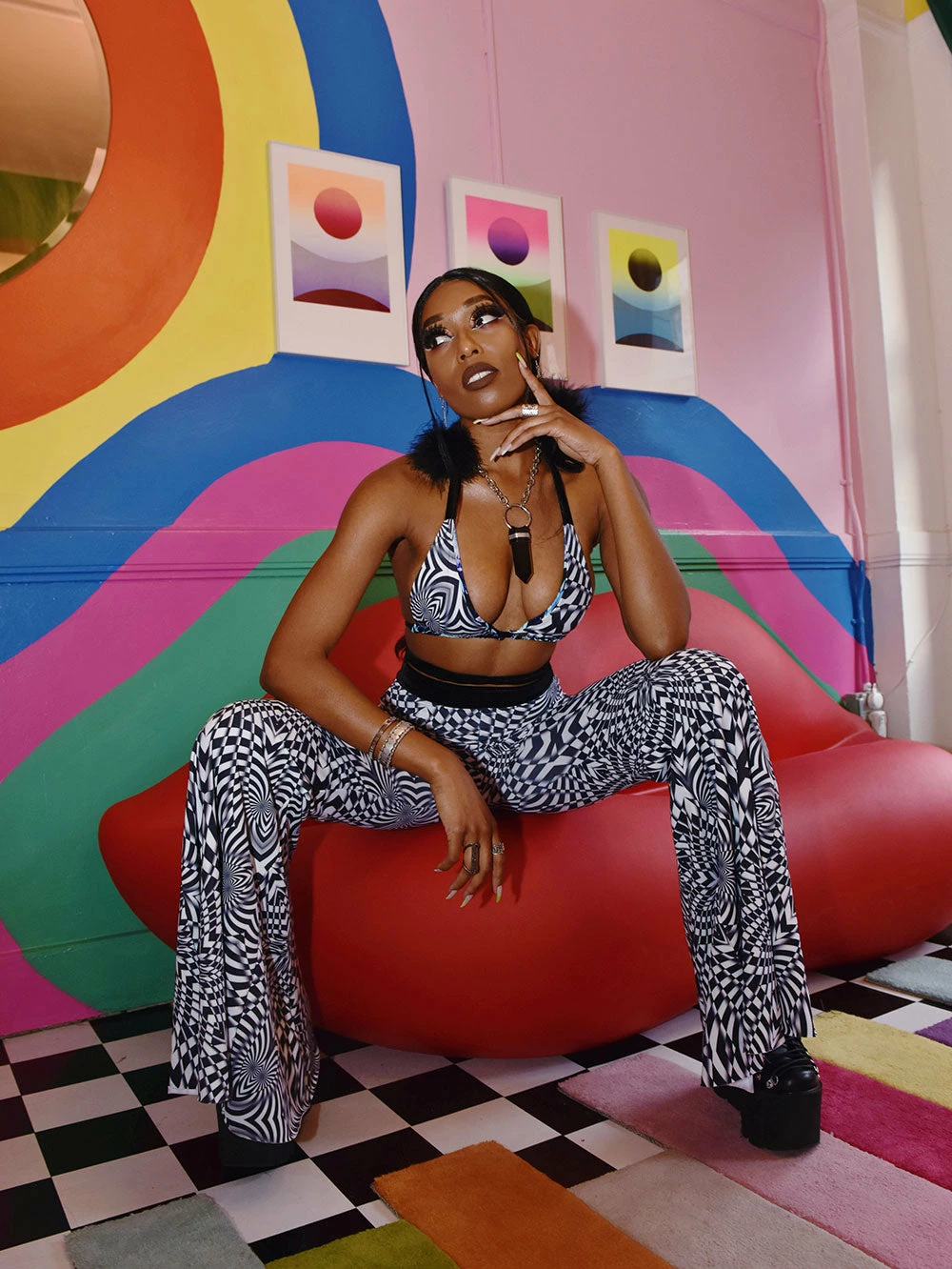 The trippiest pants of all TIME. Psychedelic black & white bell bottoms made from stretchy spandex fabric with velvet waist band.