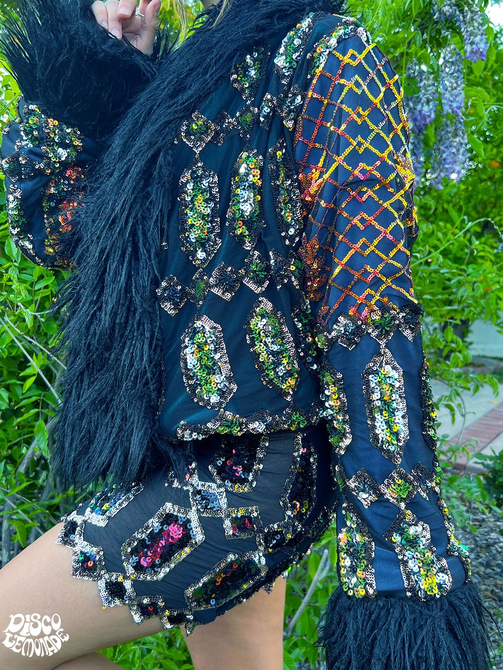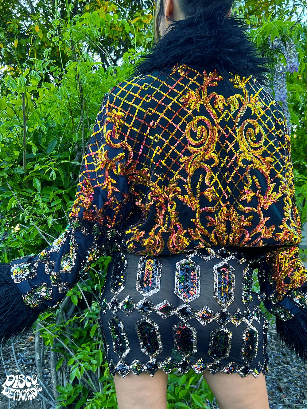 Orange sequin and ganja goddess sequin cropped coat.