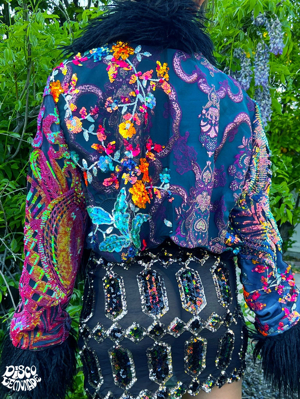 Radiance and hot pink sequin with damask upholstery cropped coat.