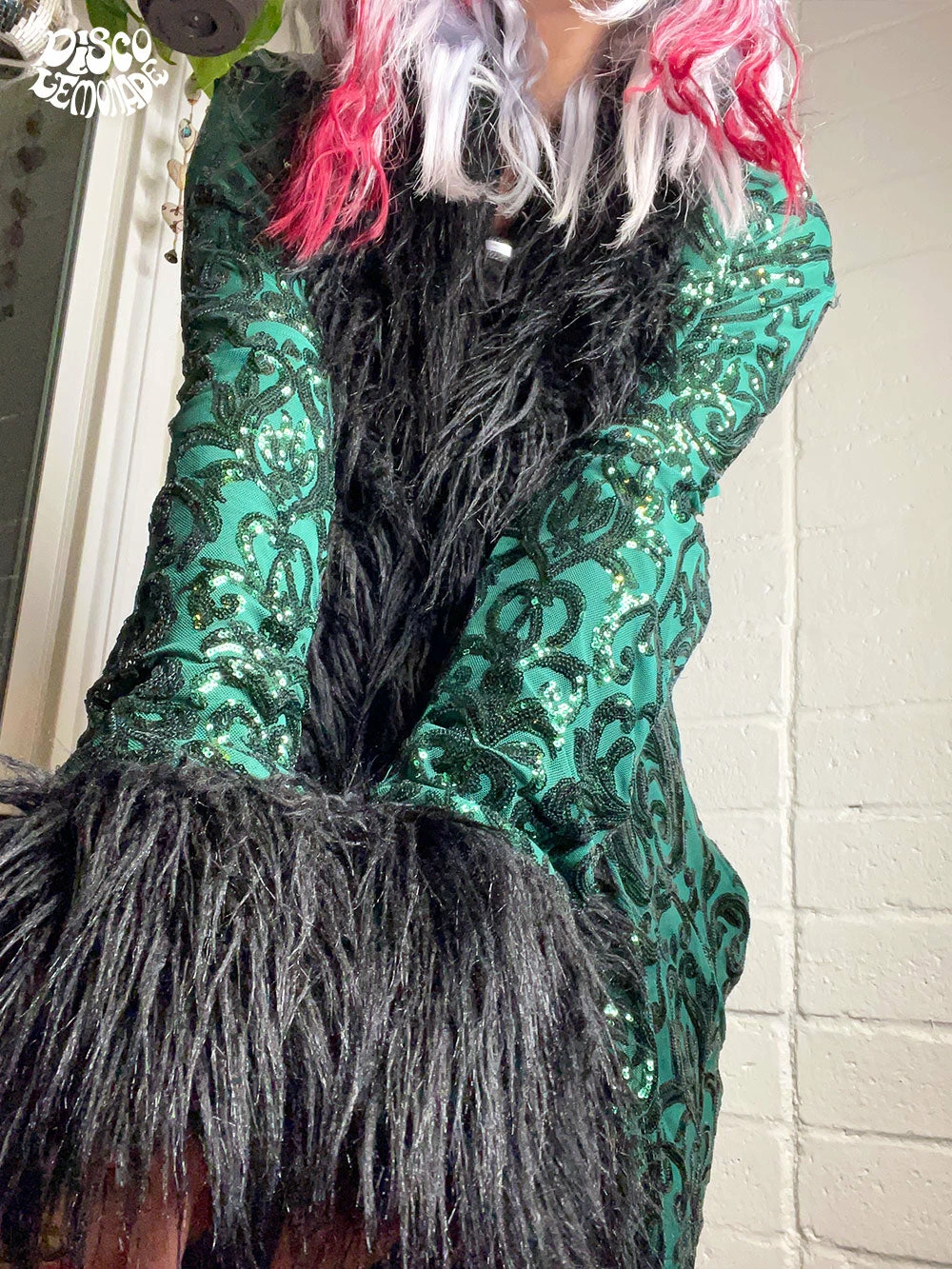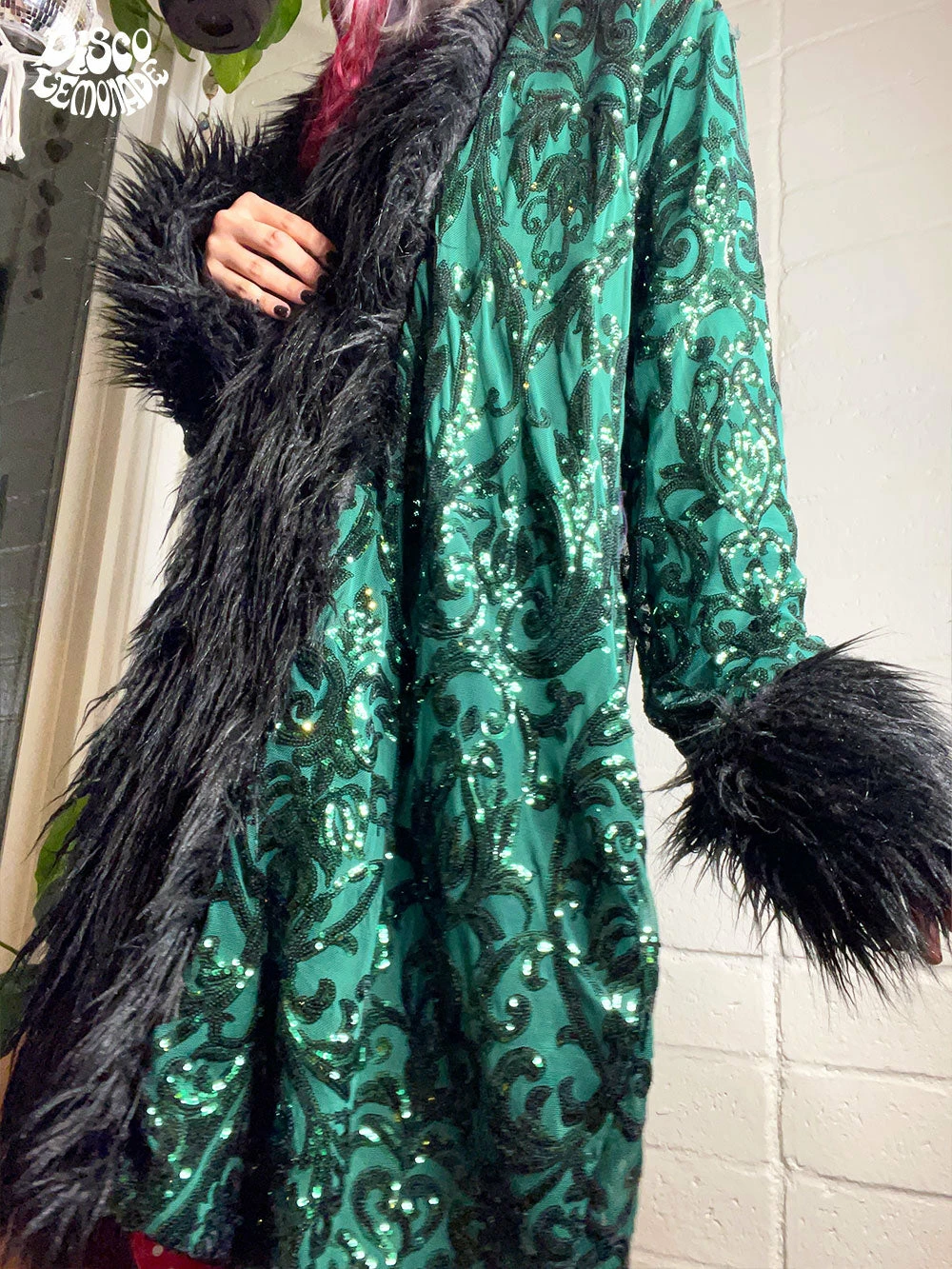 A coat of your disco daydreams ~ Oversized equin coat lined with velvet. With a faux fur collar and cuffs, she is the perfect coat for pretty much every day of your life.