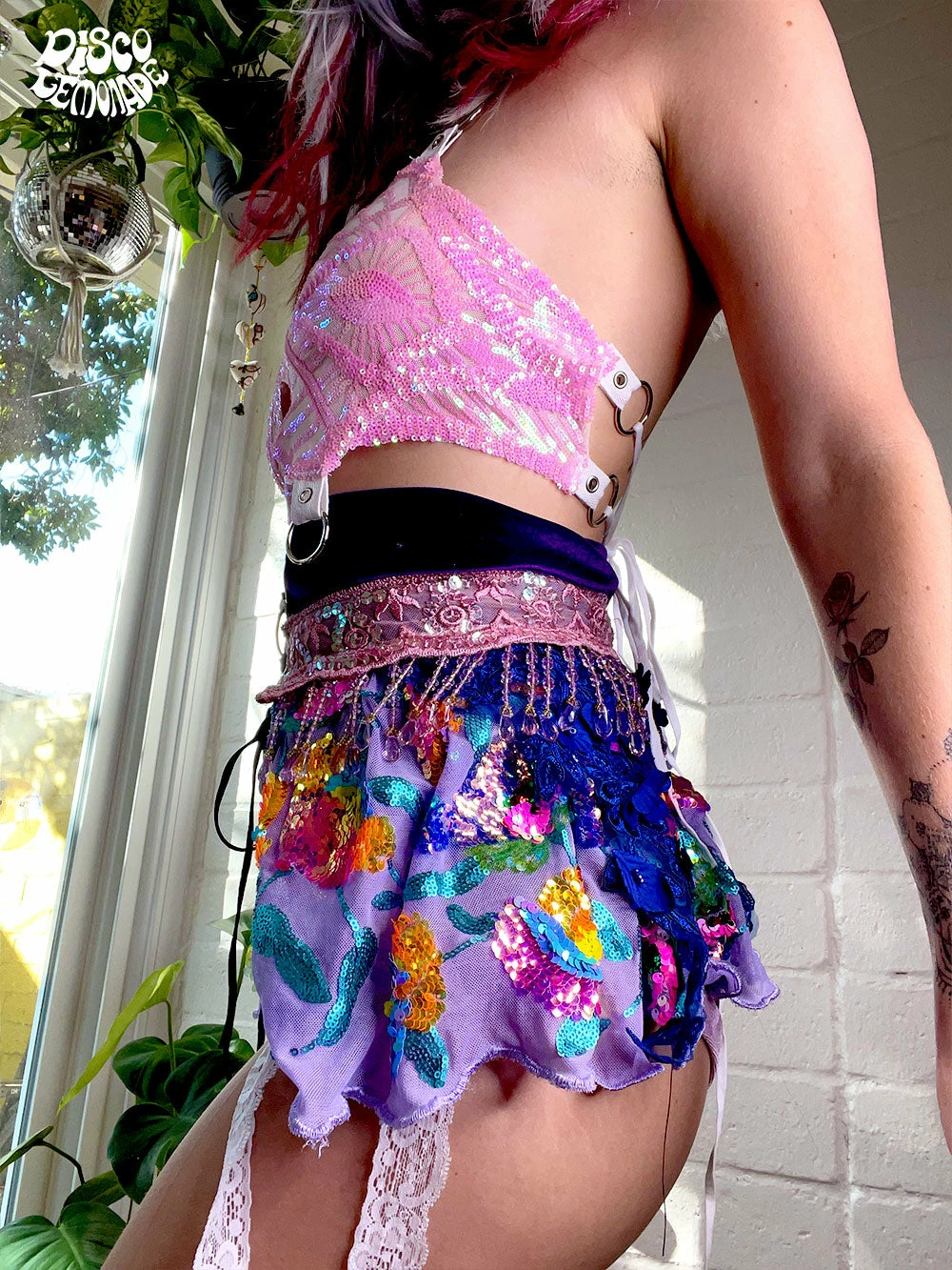 The cutest pixie bustle set that ever was. This set comes with a cut out sequin hardware lace up top, lace up shorts and bustle.Â