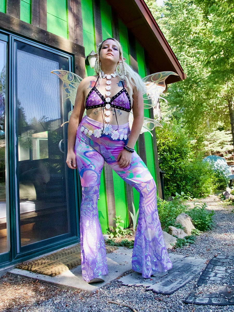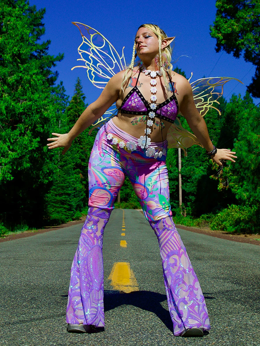 Planet shroom psychedelic cotton fabric with iridescent lavender sequin bell bottoms. Please contact [email protected] if you would like the inseam to be shortened within 2 days of purchase.