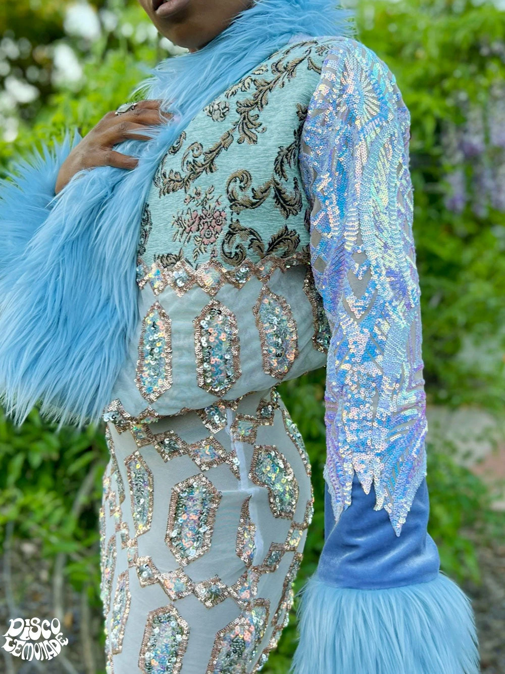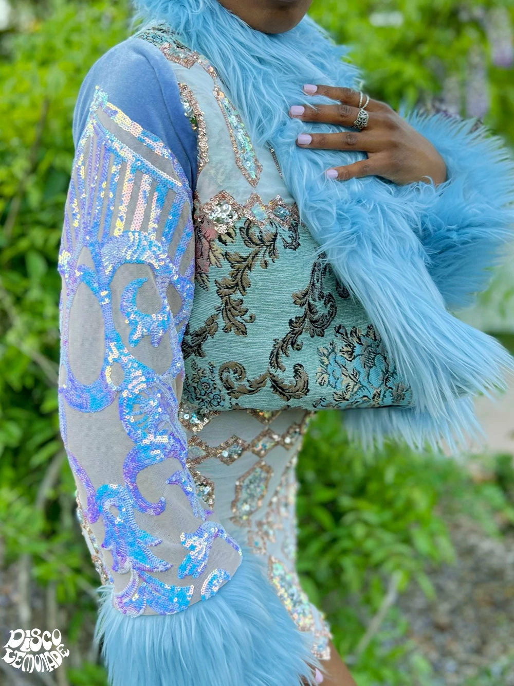 Pastel Upholstery and angel geo sequin with iridecent sequin on pastel blue velvet.