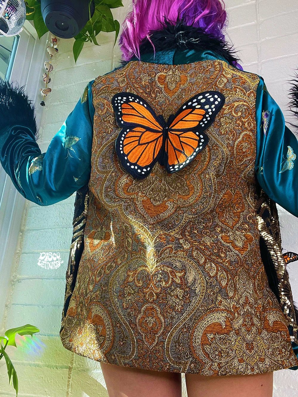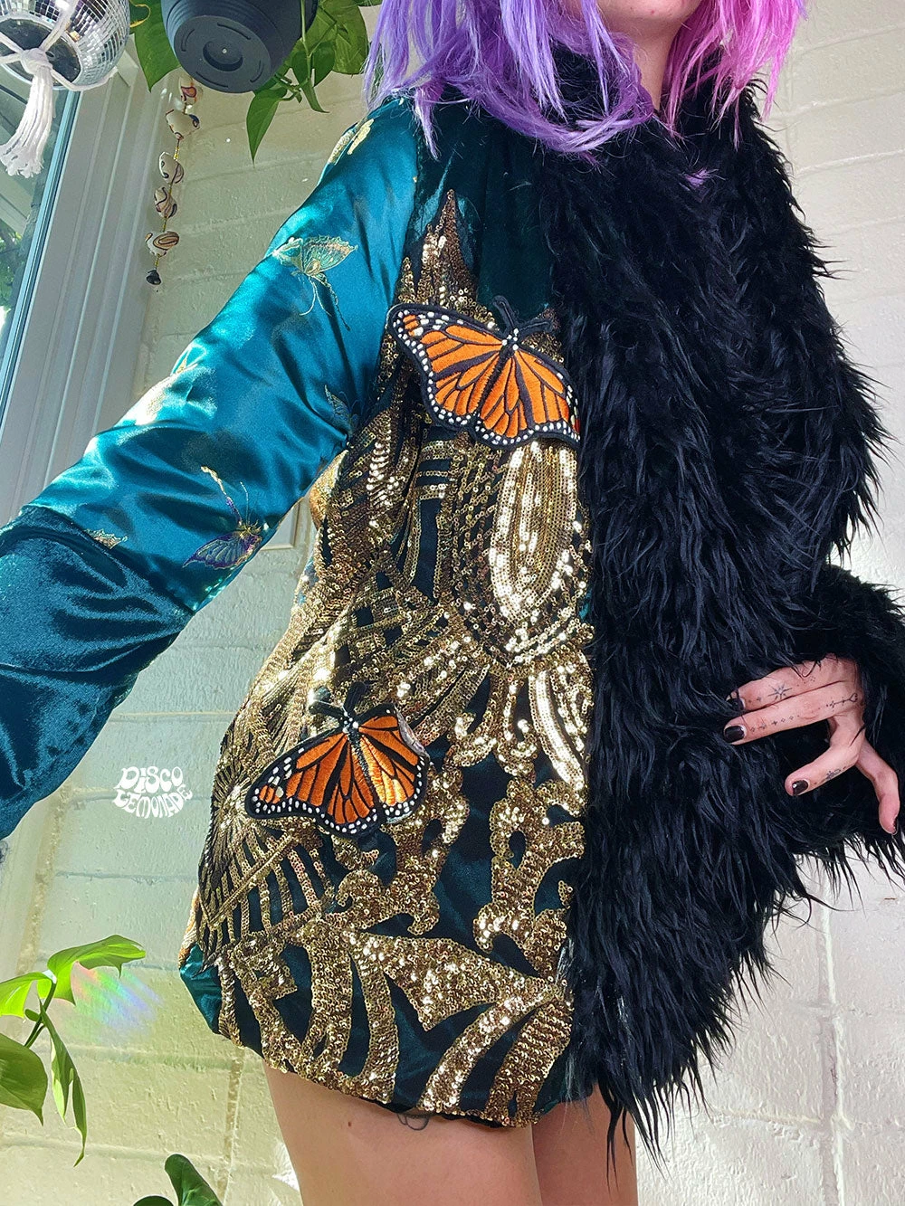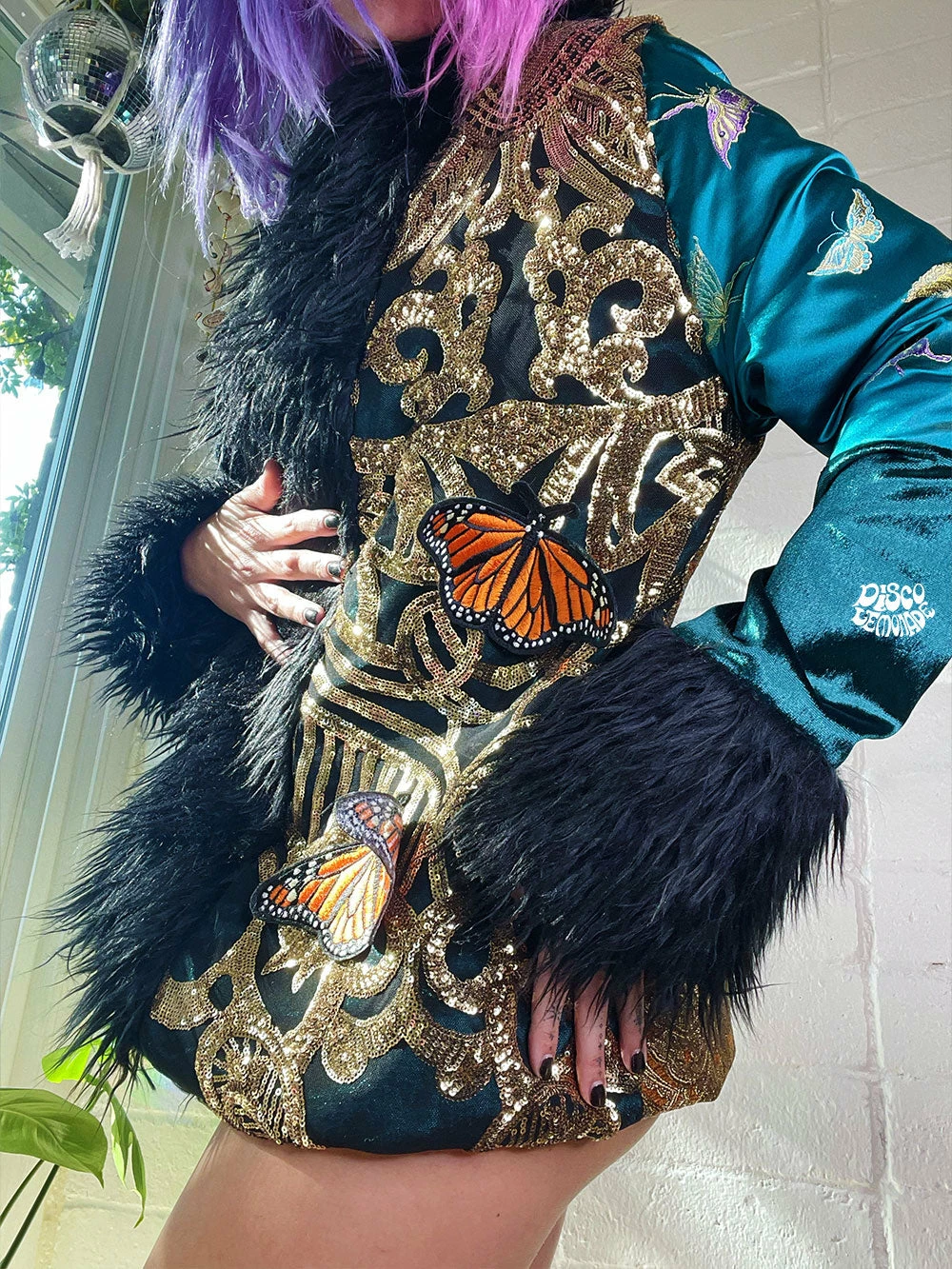 Side panels made with the classic gold disco sequin adorned with monarch butterflies