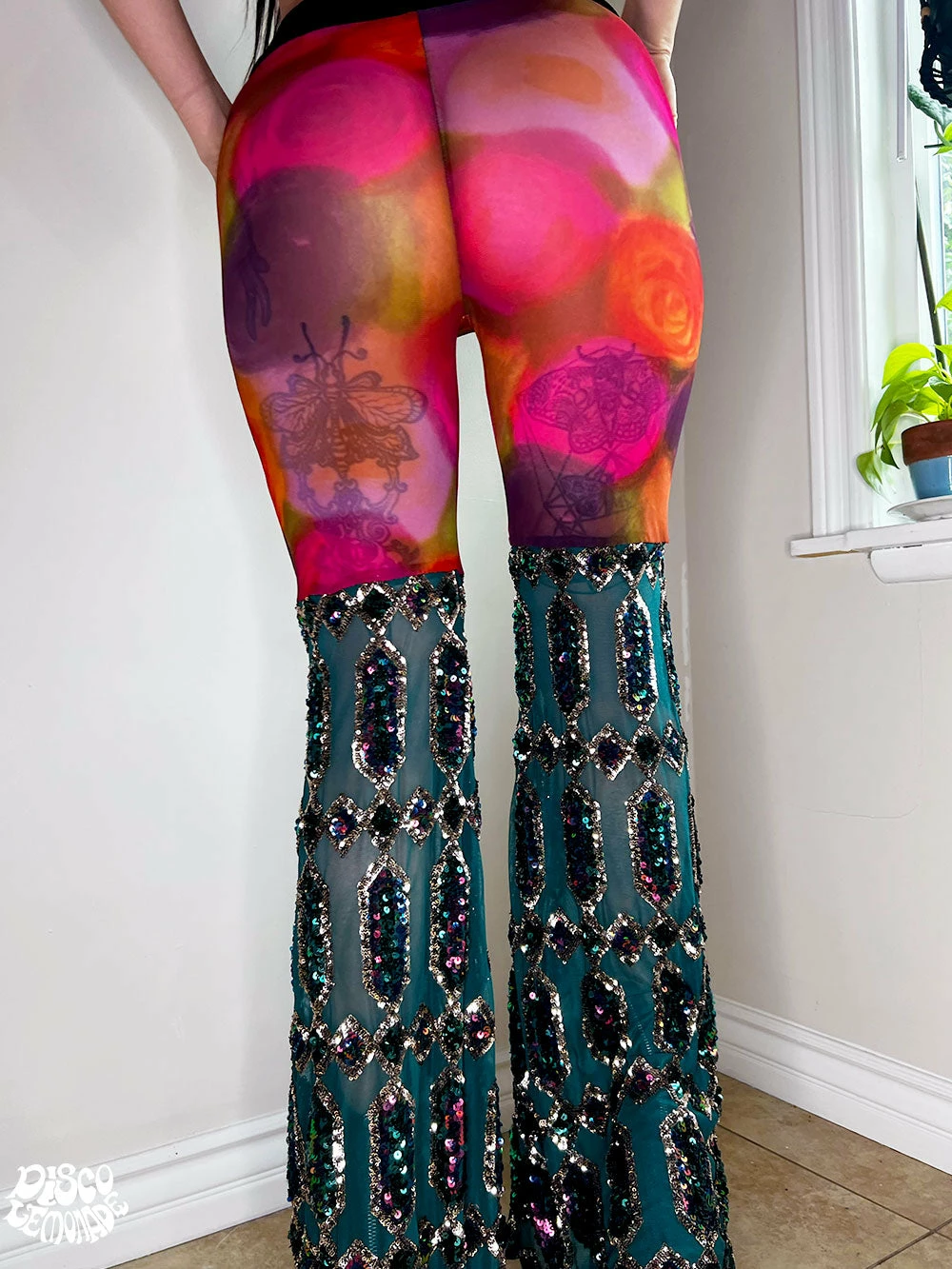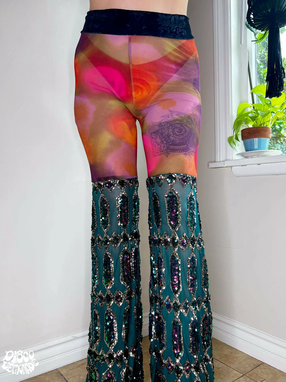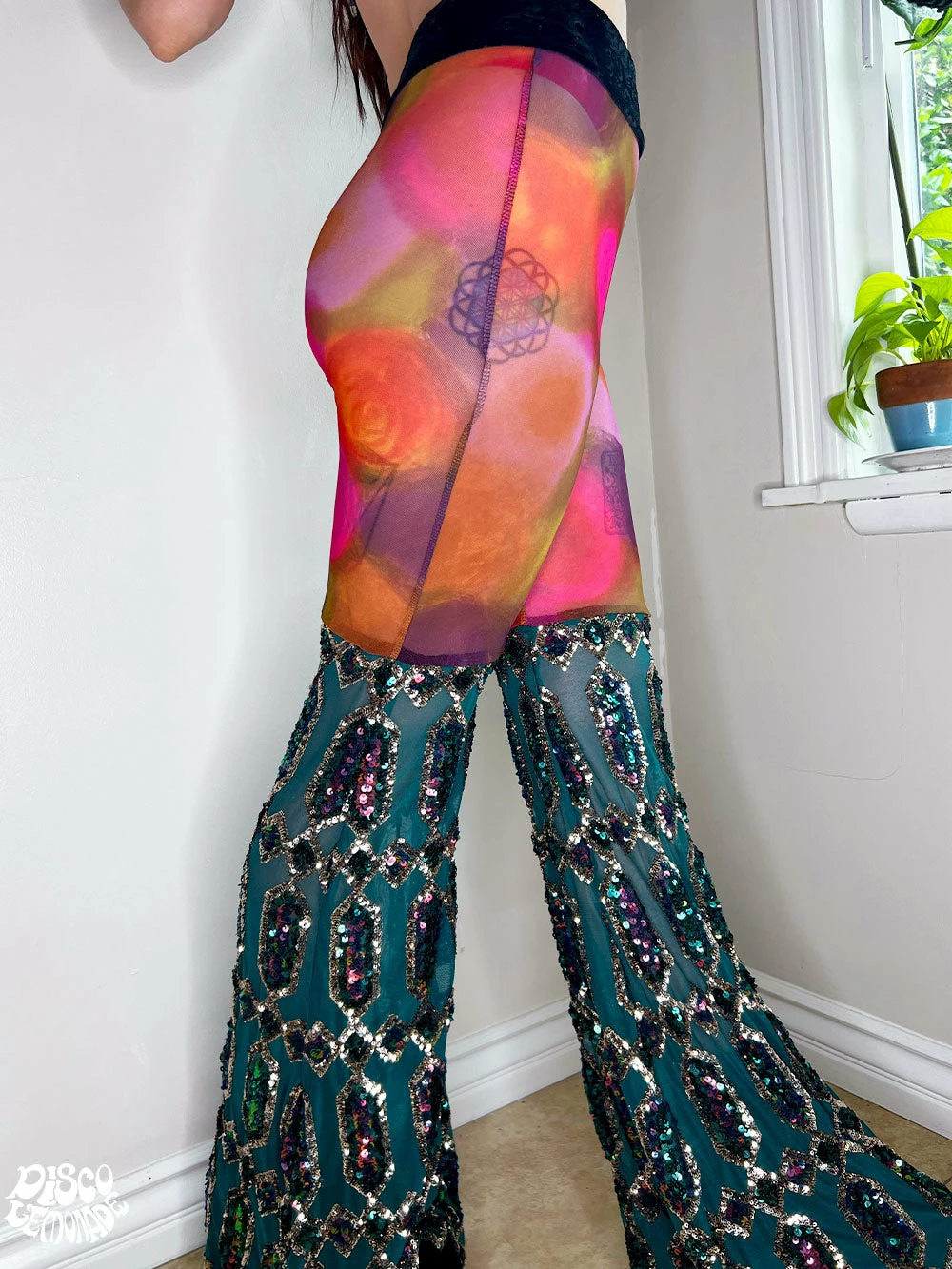 Rose mesh with emerald sequin on 4 way stretch mesh bell bottoms.