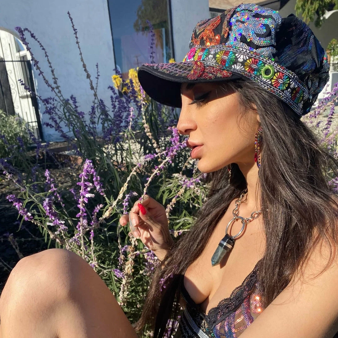 Decked out messenger hat ~ different sequin sewn on around the top & gorgeous bohemian trimming along the bottom with a sequin covered brim ~ elastic band in back so it fits a variety of head shapes! woo!