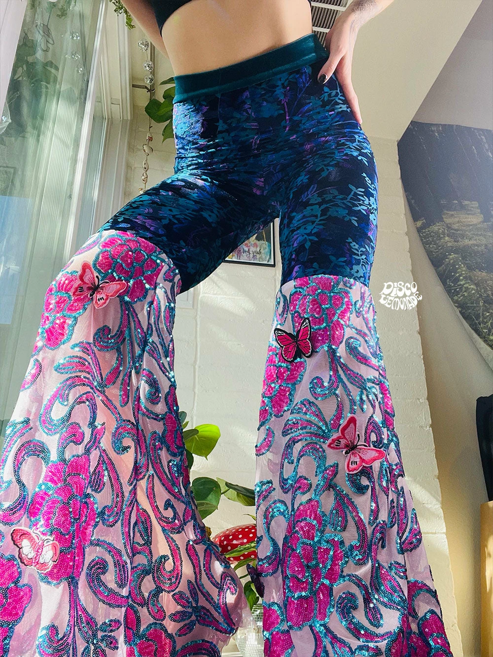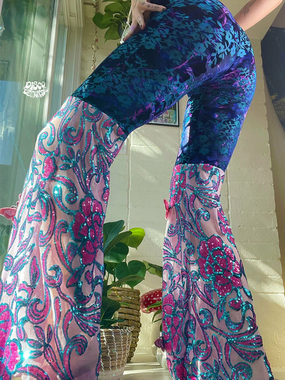 Burnout blue and purple velvet bells with pink & blue floral sequin bell bottoms. Please contact [email protected] if you would like the inseam to be shortened within 2 days of purchase.