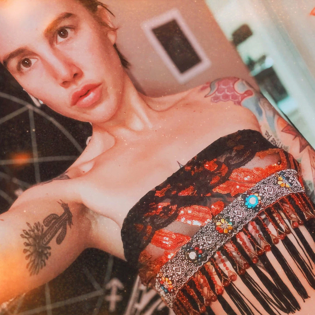 Strapless sequin Disco Top with beaded fringe layers upon black fringe & bohemian trim ~ Lace ties around back