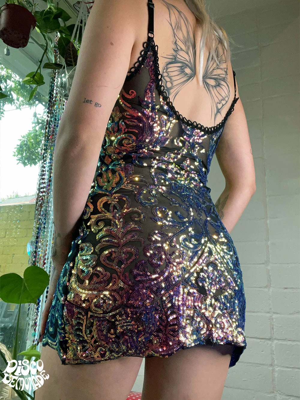 Bodycon beetle/radiant sequin on 4 way stretch mesh dress. Seams are covered with lace to prevent scratchies! Adjustable bra straps.