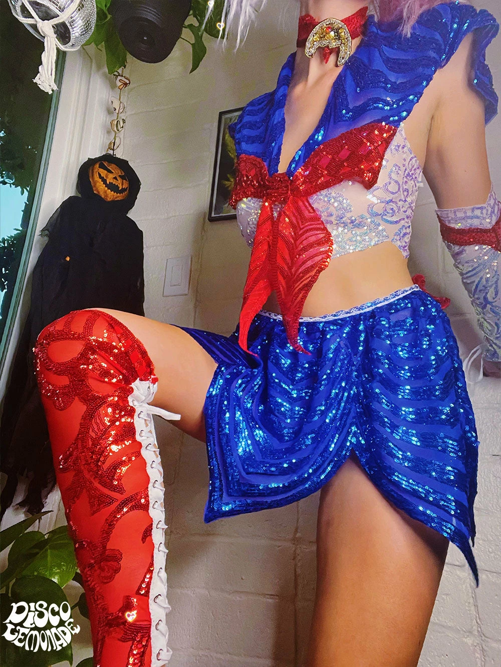 This one of a kind Sailor Moon outfit comes with the ENTIRE package: lace up arm bands, collar/bow shoulder piece, white top, skater skirt, Moon choker & lace up leg pieces.