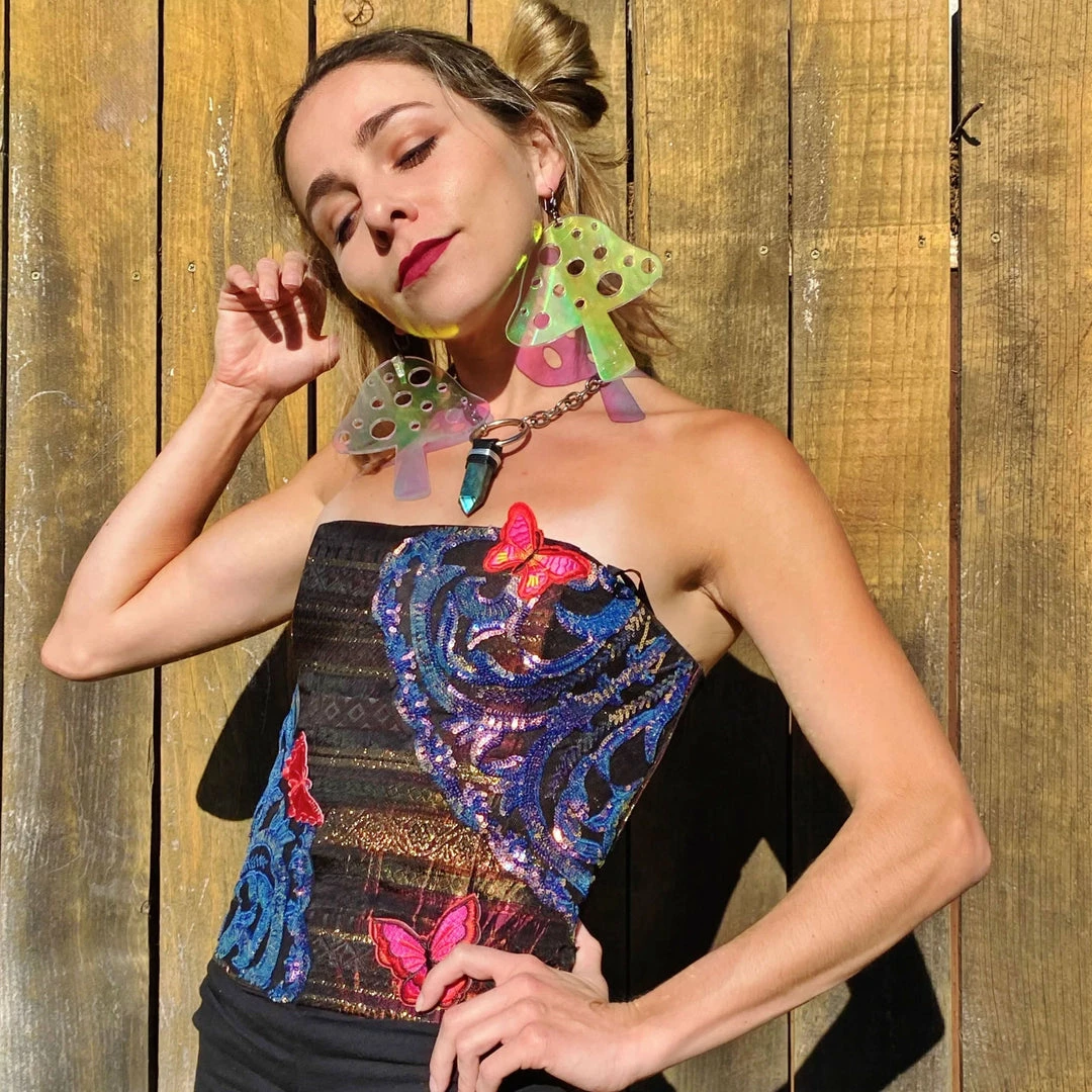 The Majestic Warrior Bustier is a vintage reworked zip up bustier with sparky purples, blues, pinks & golds layered on top of a gorgeous maroon, red & gold base ~ with red butterfly embellishments this is the perfect fairy piece for your next fit!Â