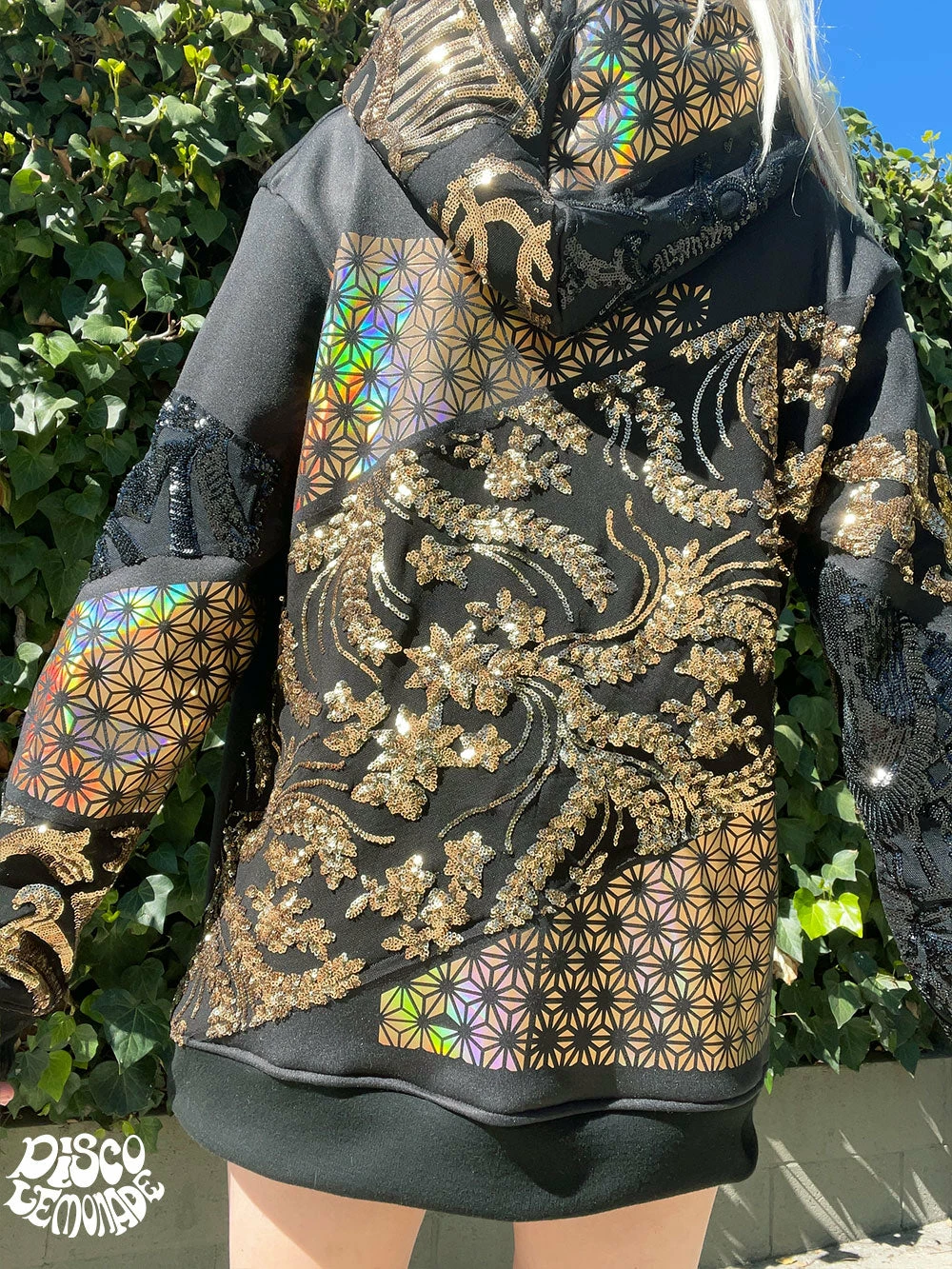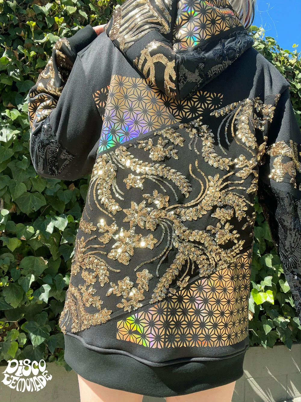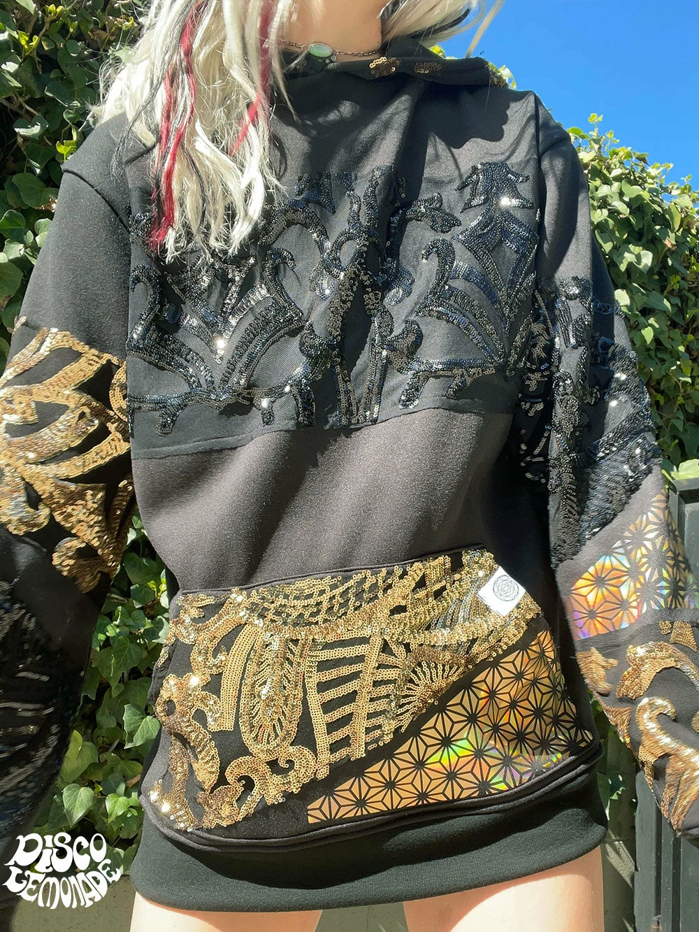 Comfy hoodie with sequin and vinyl detailing.