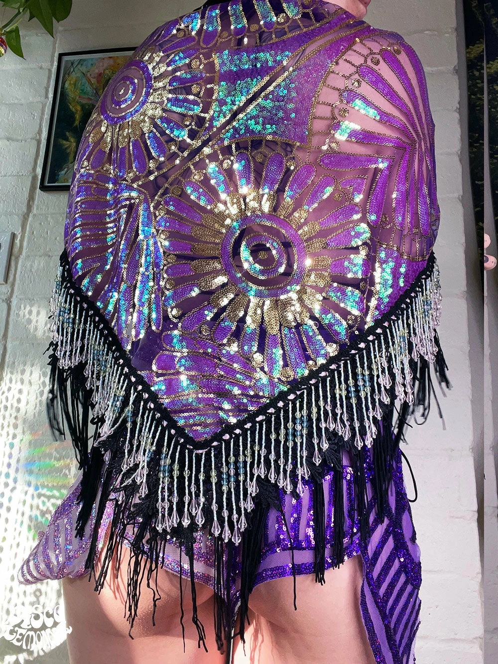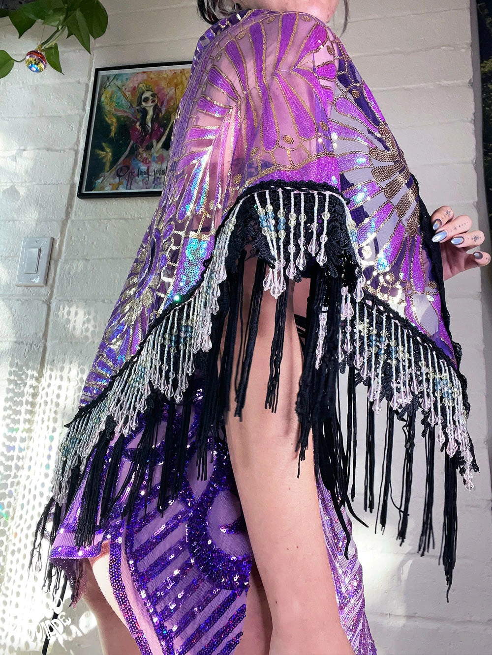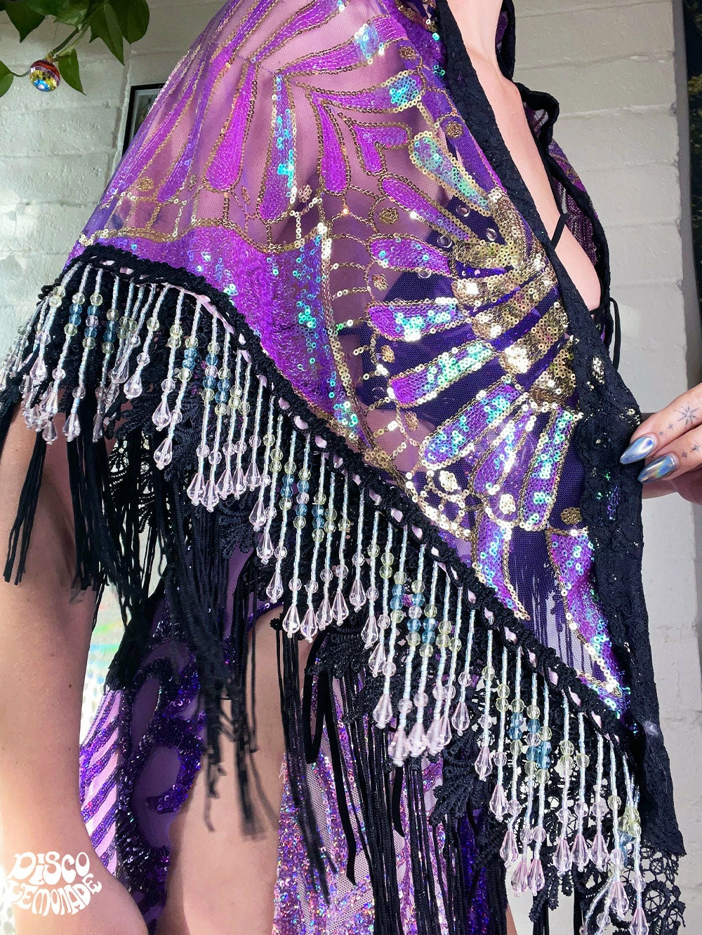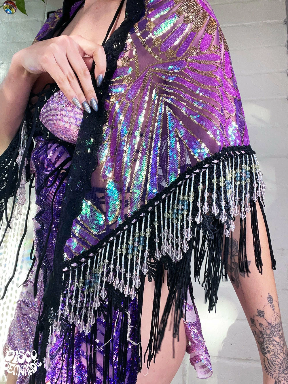 Purple & gold trippy sequin (non stretch) Goddess Shawl ~ with black fringe, black lace trimming & beading.