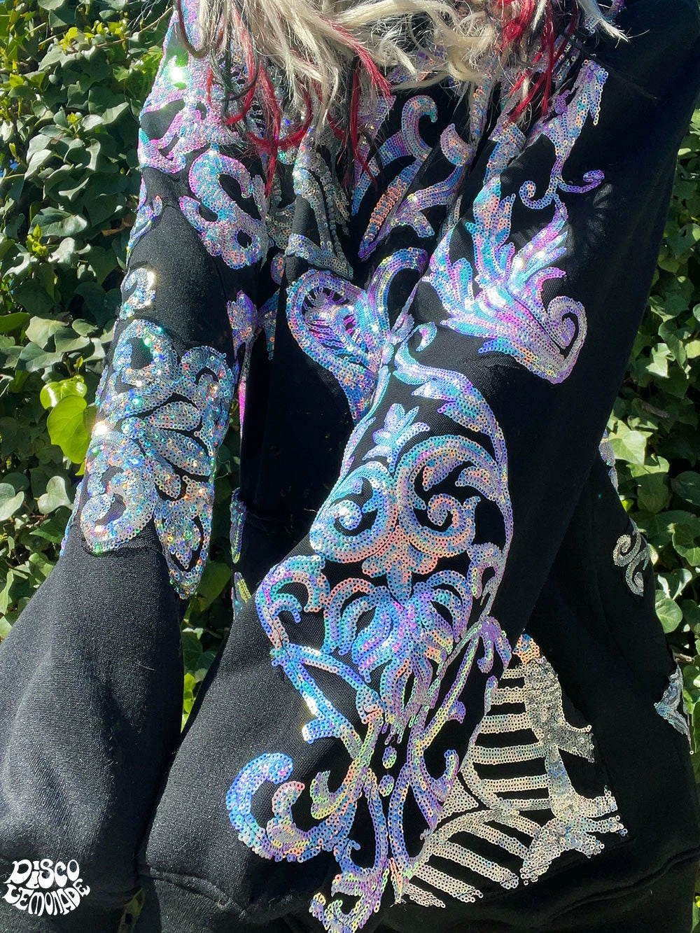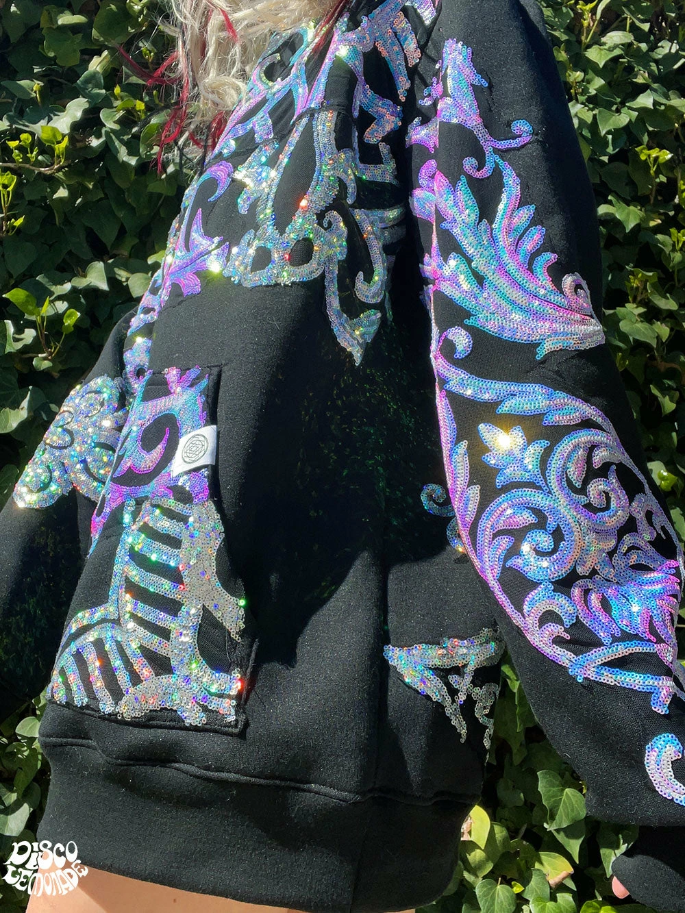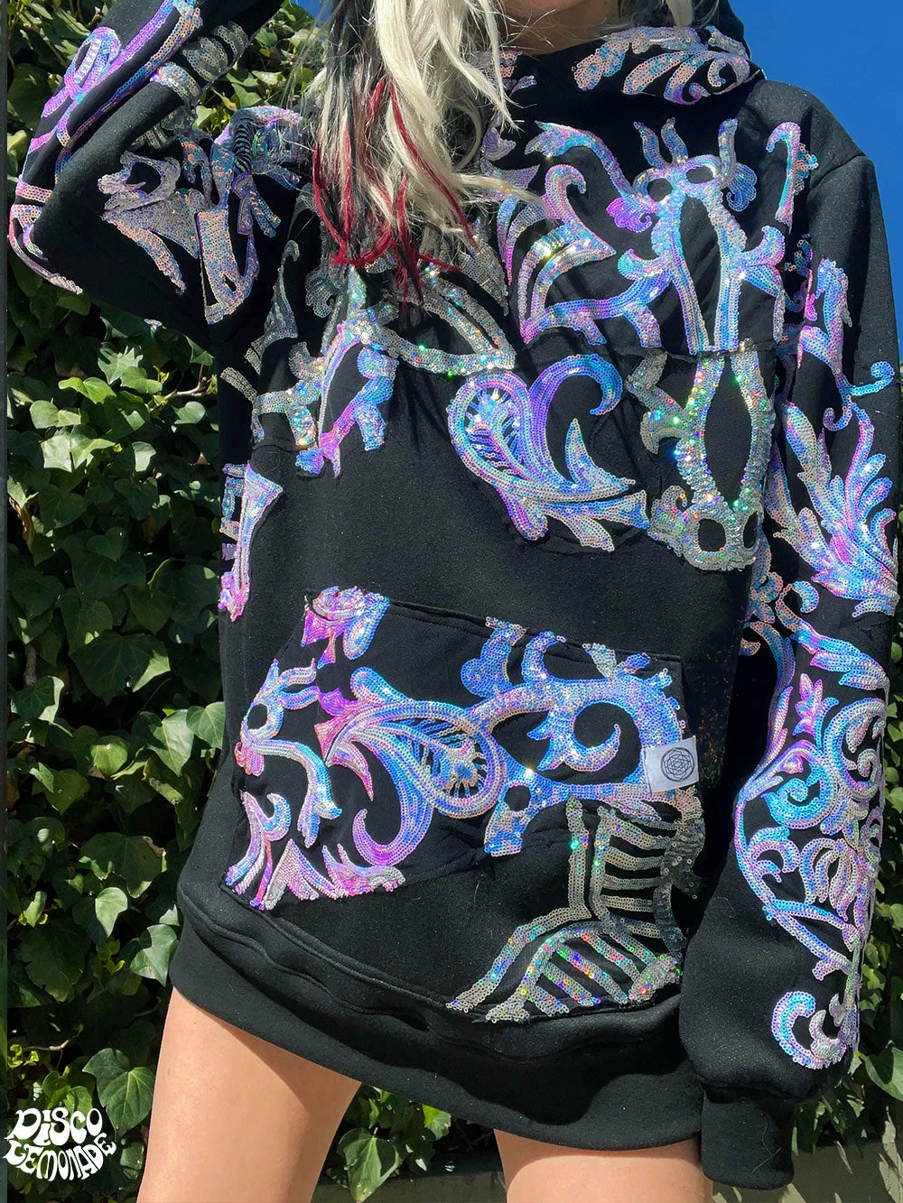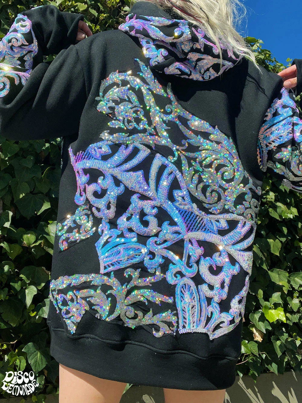 Comfy hoodie with sequin and vinyl detailing.
