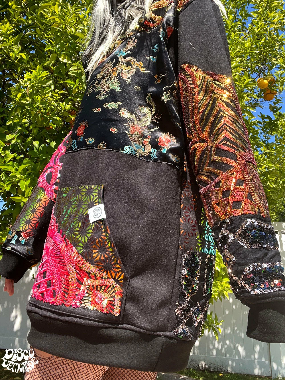 Comfy hoodie with sequin, brocade & vinyl detailing.