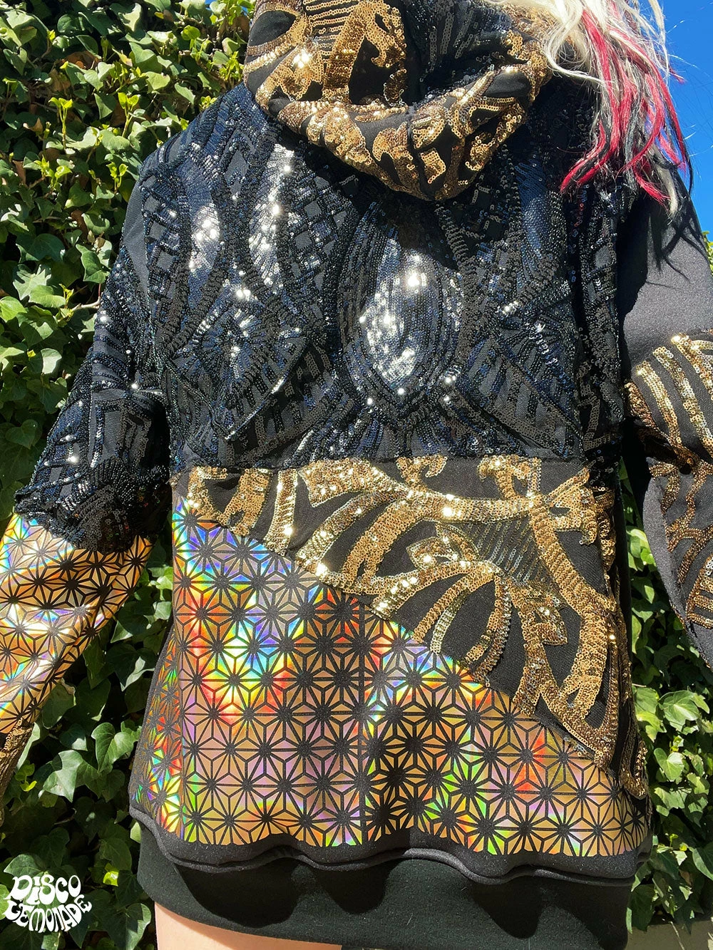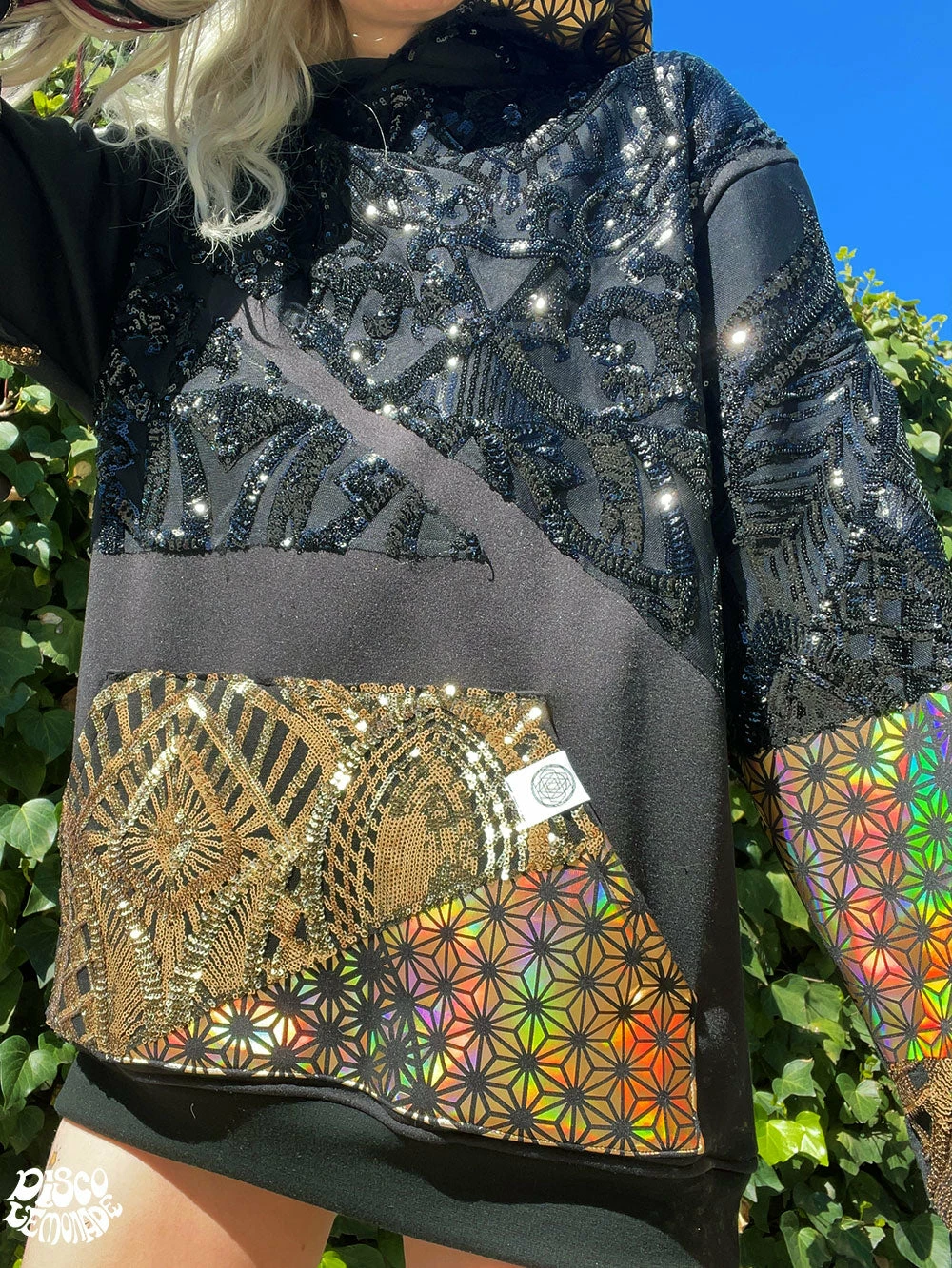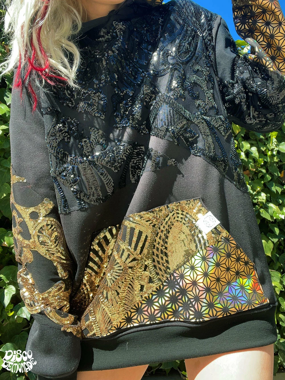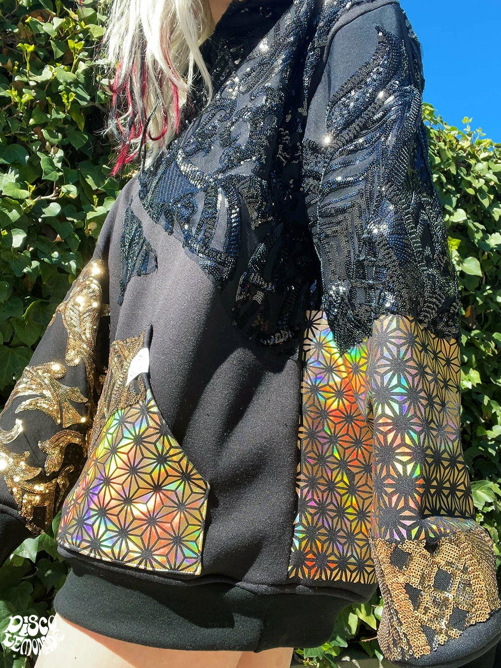Comfy hoodie with sequin and vinyl detailing.