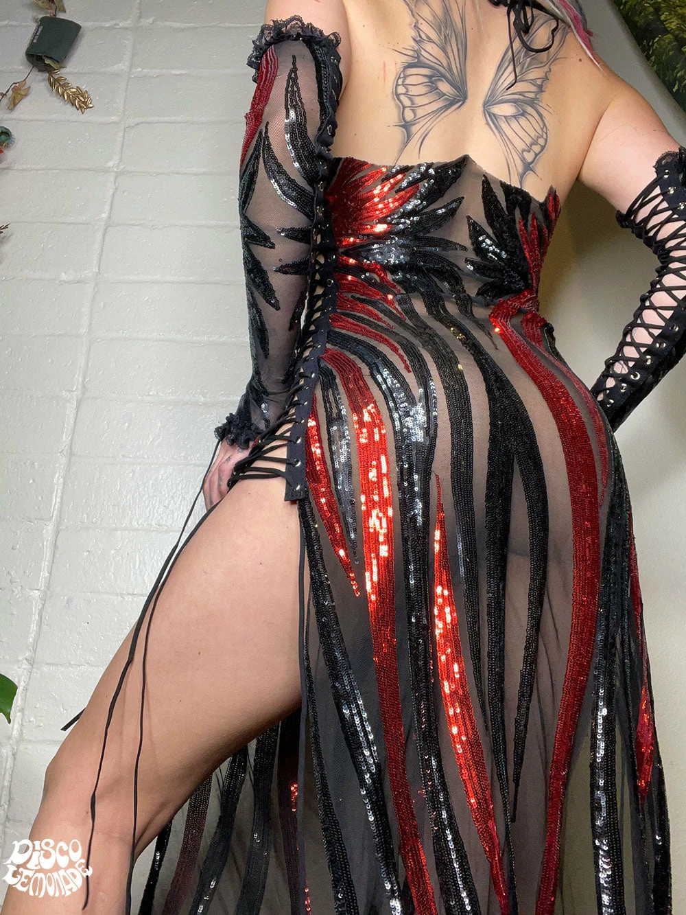 Maxi dress 4 way stretch sequin with red & black sequin with grungy cut out hem, lace up arm bands & choker.
